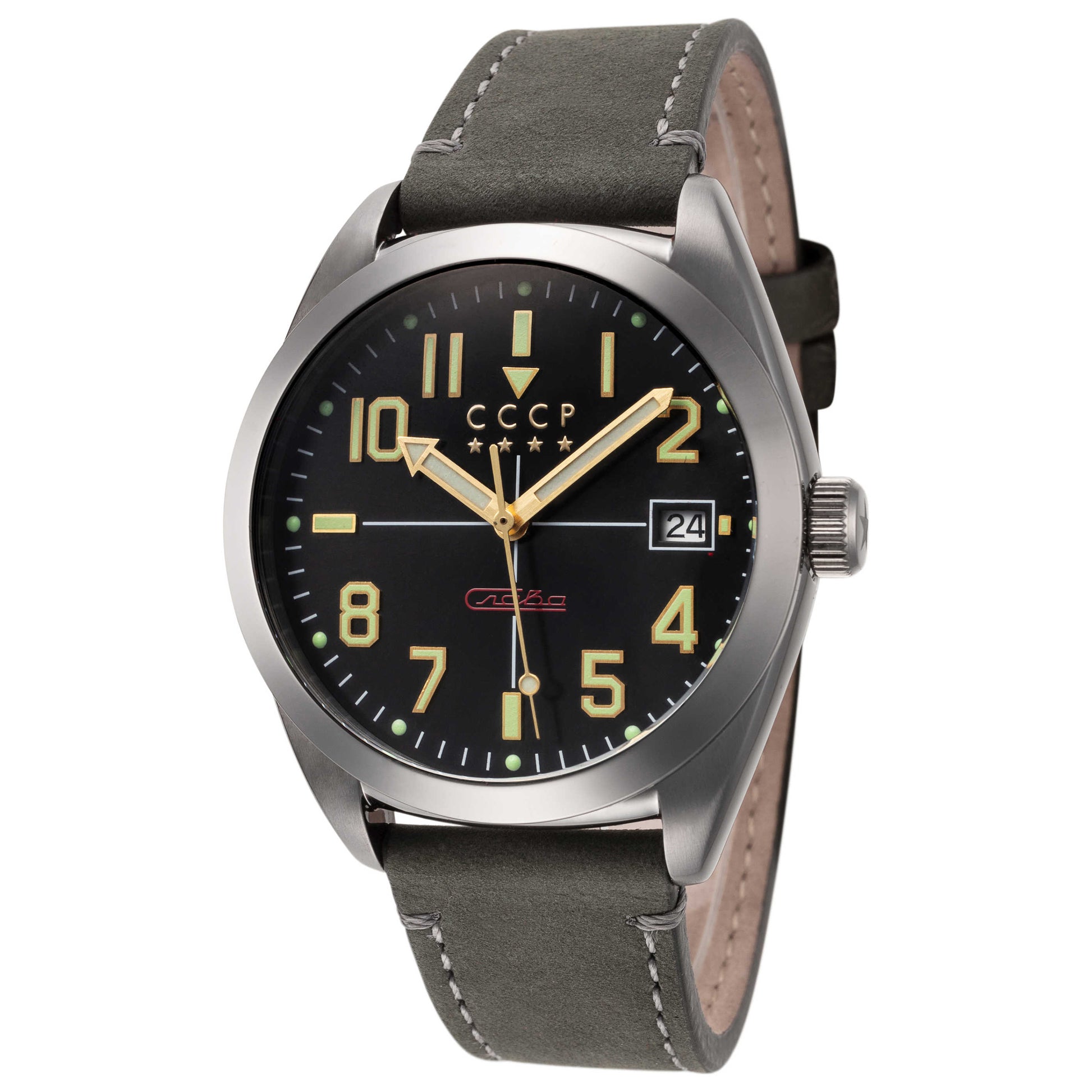 Indulge in the masculinity and sophistication of the CCCP Gromov men's watch, a perfect blend of style and durability. This automatic timepiece, powered by a Slava H335 movement, offers an impressive 40-hour power reserve and easy operation with a pull and push crown. The 40mm grey stainless steel case ensures resilience and boasts a black dial encased in mineral crystal. With 50m water resistance, this watch is your reliable companion for all adventures. Complementing the design is the green leather strap, which snugly fits around the wrist, secured with a pin buckle. CP-7050-05