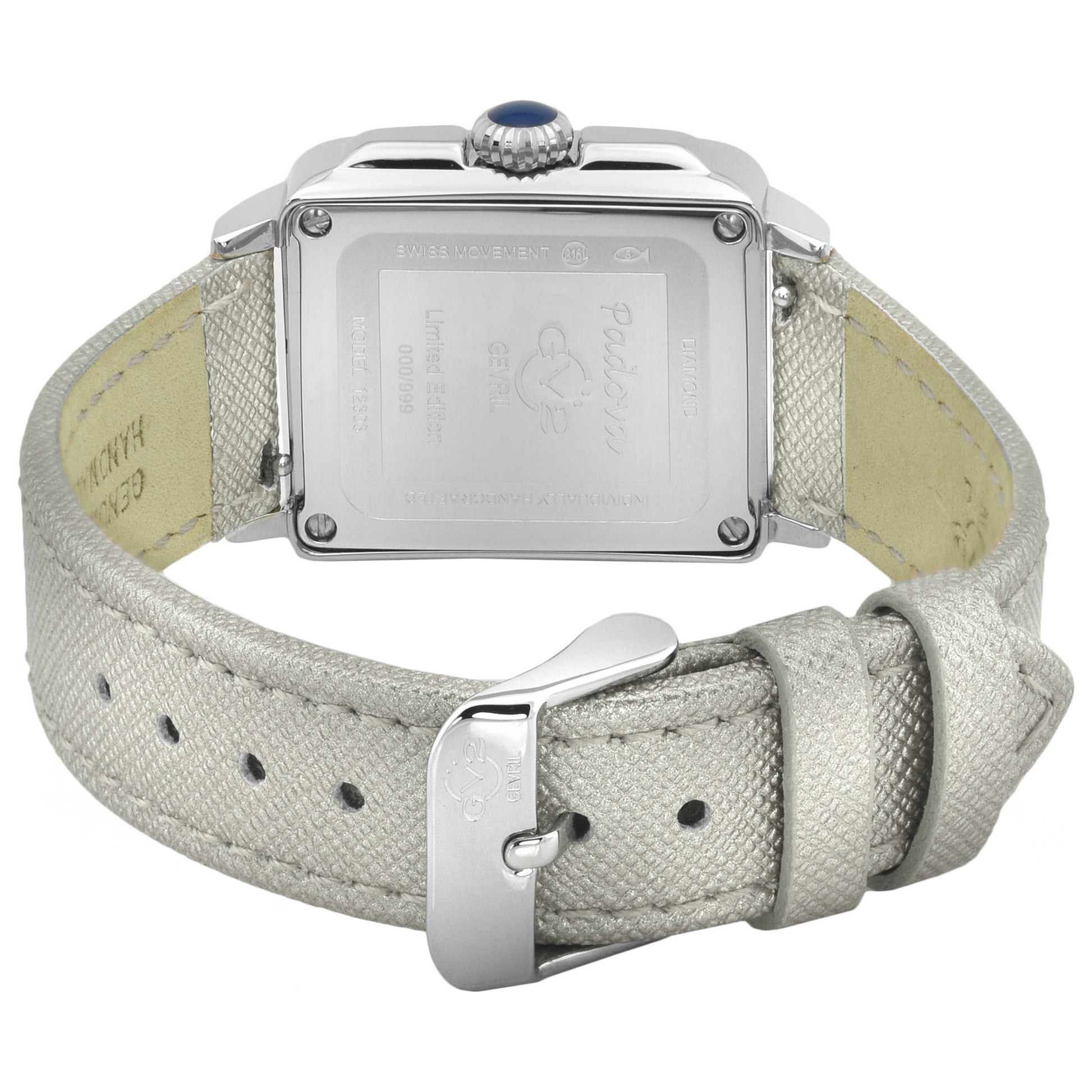 Elevate your style with the Padova women's watch from the distinguished brand, GV2 by Gevril. Swiss-made with precise quartz movement, this timepiece features a rectangular 30mm stainless steel case adorned with a grey dial, and is safeguarded by a scratch-resistant, anti-reflective sapphire crystal. The watch's grey leather strap beautifully complements its case, securing comfortably on your wrist with a pin buckle. It boasts a 30m water resistance and features a reliable pull and push crown. Made in Switzerland, the closed back design adds to its overall durability and sophistication. 12301