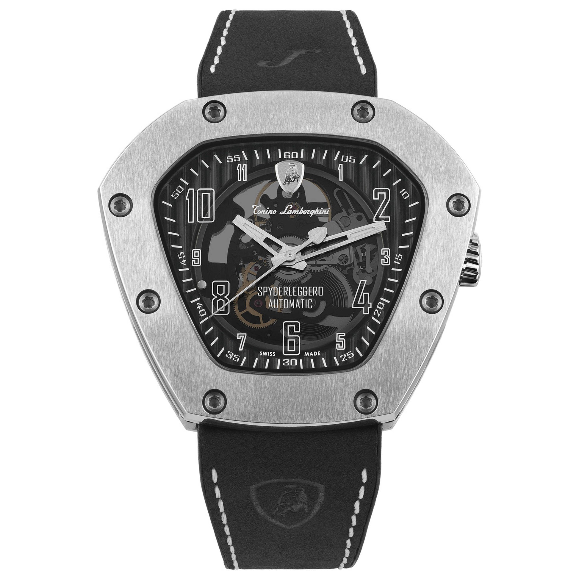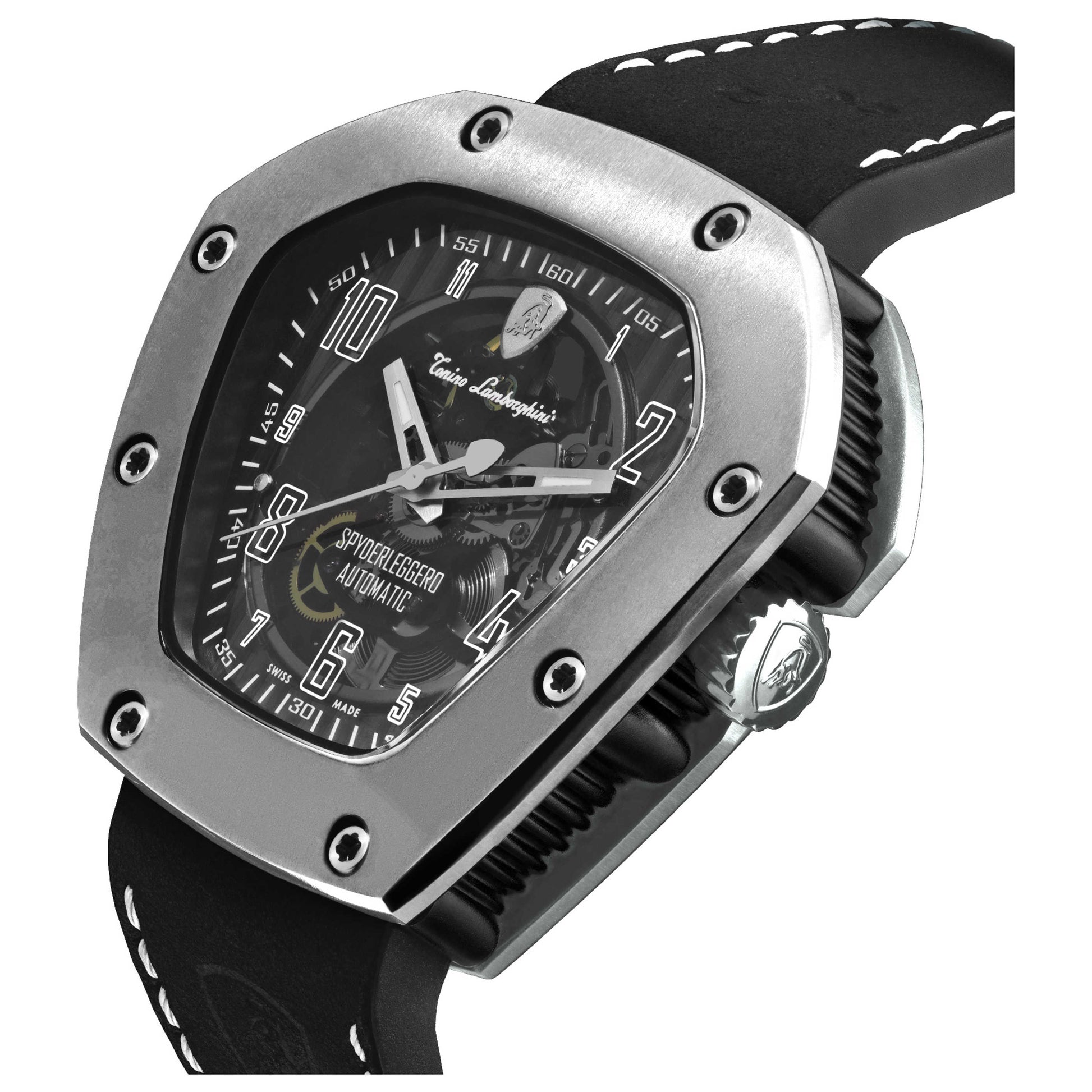 Discover the distinctive elegance of the Tonino Lamborghini Spyderleggero watch, a must-have accessory for men with a taste for unique style. This Swiss-made timepiece flaunts a unique 51.5mm titanium case, with an exhibition back and a scratch-resistant sapphire crystal protecting the dial. Its black dial is powered by an automatic Swiss-made movement, promising 38 hours of power reserve. Navigating the time is easy with the pull and push crown, and it's also rated water-resistant up to 100m. This masterpiece comes with a black leather strap, ensuring a snug fit with its deployment clasp. TLF-T06-1