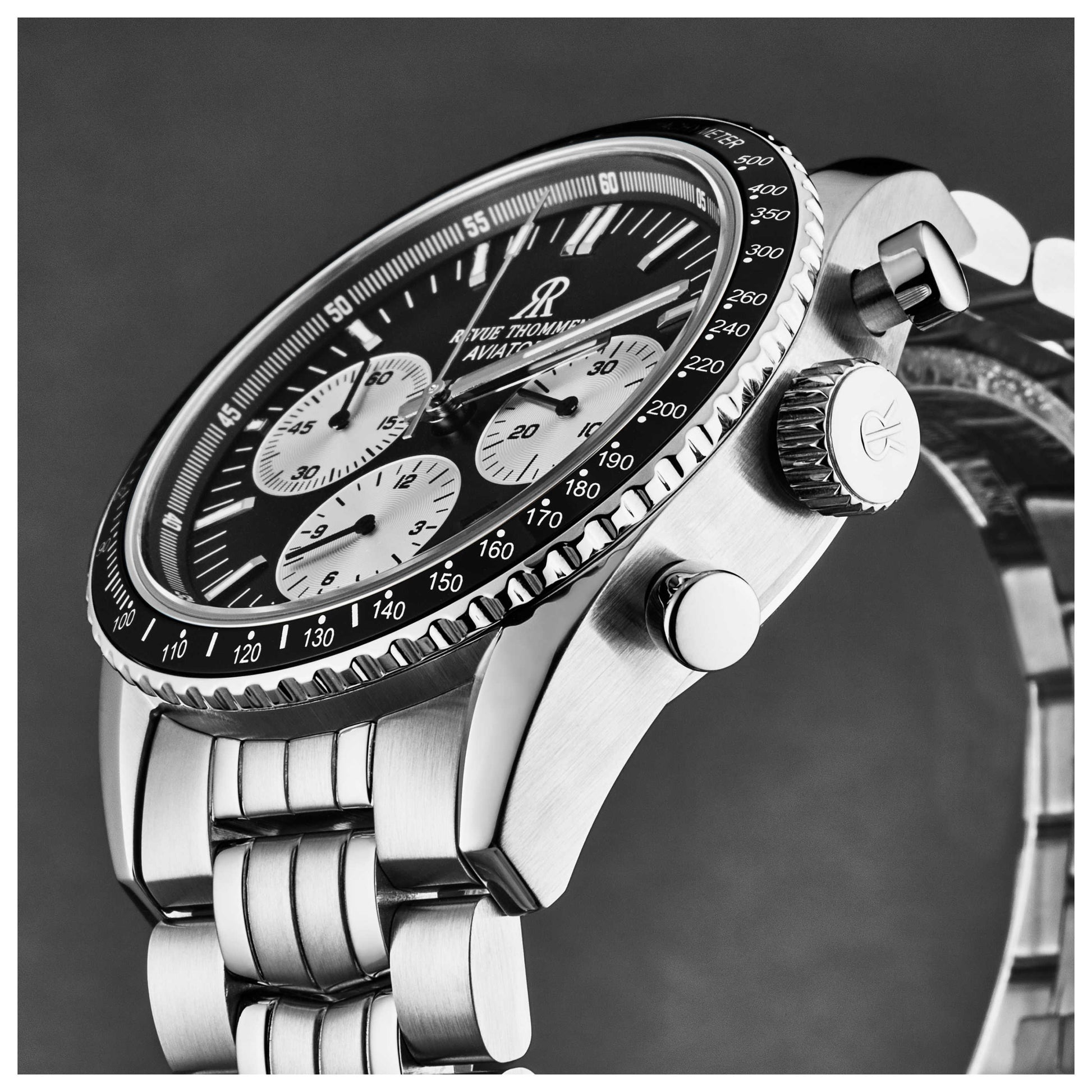 Introducing the Revue Thommen Aviator, a distinctive watch tailored for the modern man. Swiss-made, it is powered by the SW510A automatic movement, ensuring reliable timekeeping. The 42mm stainless steel round case houses a black dial, covered by scratch-resistant sapphire crystal and framed by a uni-directional bezel. The silver stainless steel bracelet with a deployment clasp adds a touch of sleek elegance. With its 50m water resistance and features like a chronograph and date, it seamlessly combines style and functionality. This watch, originating from Switzerland, truly embodies superior craftsmanship. 17000.6134