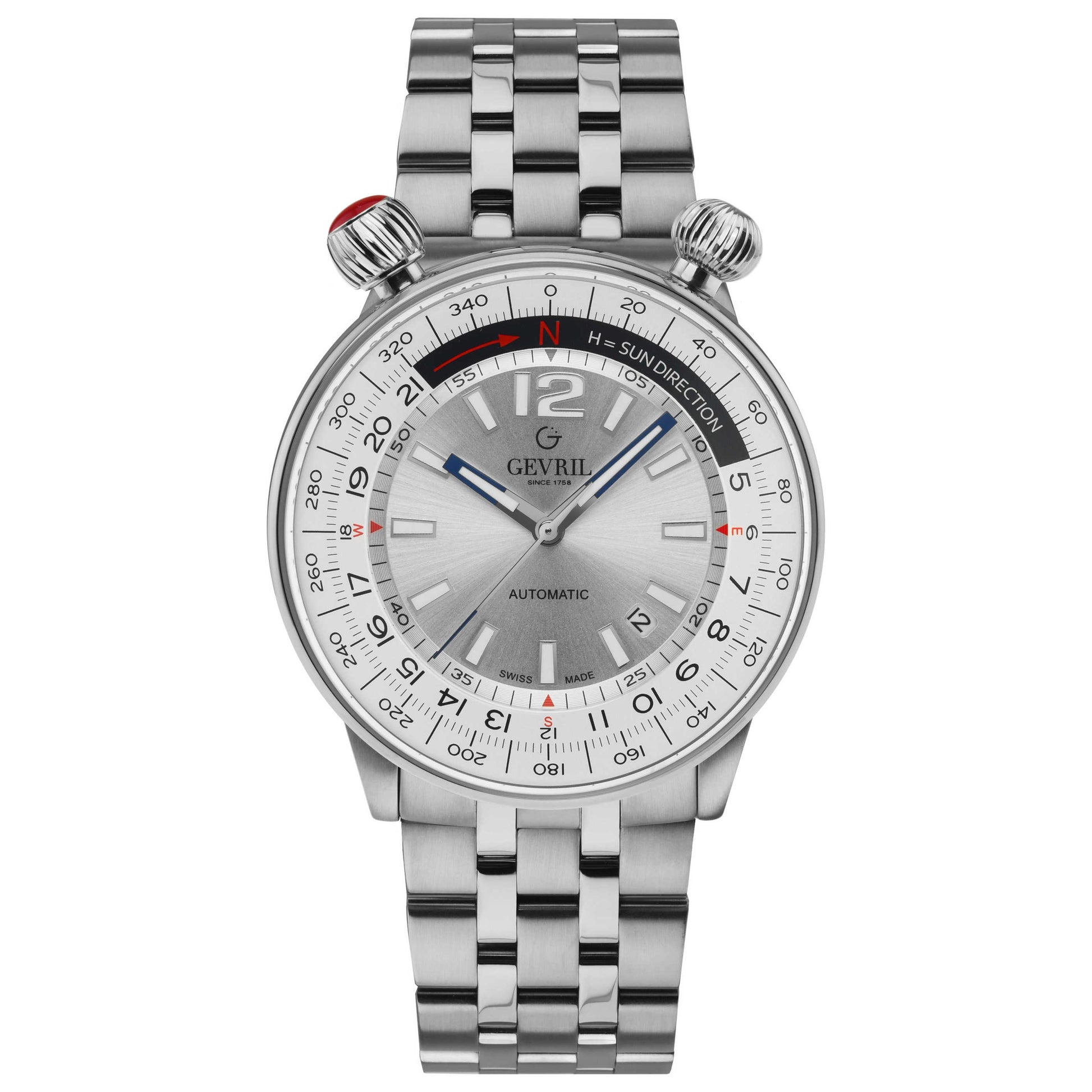 Step up your style game with the Gevril Wallabout men's watch, a sophisticated Swiss-made timepiece that exudes modern elegance. This automatic watch is enclosed in a round 44mm stainless steel case, featuring a sleek silver dial under scratch-resistant, anti-reflective sapphire crystal. Its pull and push crown ensures easy adjustments, while a closed case back and 50m water resistance offer top-notch durability. The silver stainless steel bracelet brings a seamless flow to the design, secured with a deployment clasp. The watch also boasts a date feature, offering both style and functionality. 48560