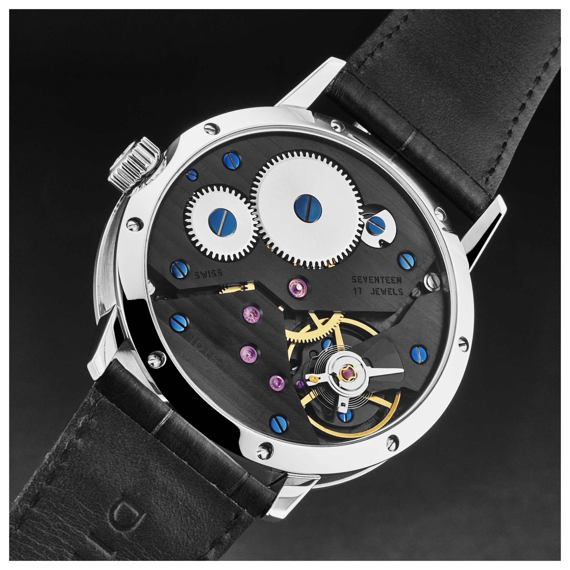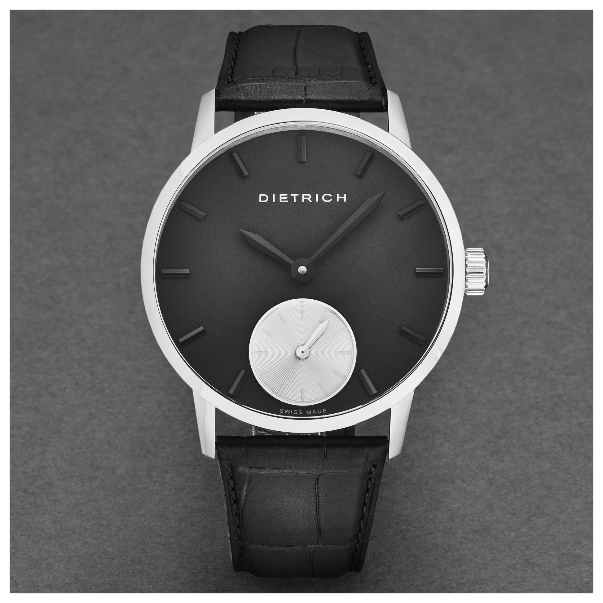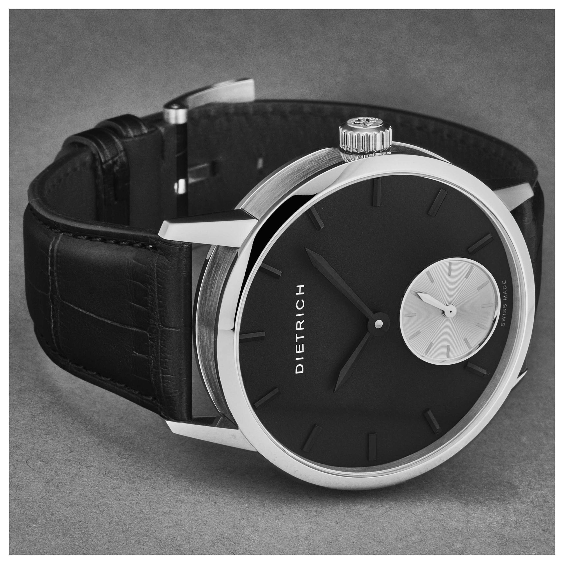Discover the edgy appeal of the Dietrich Night watch, an exemplary piece for the contemporary man. Swiss-made with a manual-wind ETA 6498-1 movement, this round 43mm stainless steel watch features an exhibition case back, enclosed by a scratch-resistant sapphire crystal. The striking black dial and leather strap with a pin buckle add to its sophisticated look. The watch's pull and push crown allows for smooth operation, and with a water resistance of up to 30m, it's ready to handle unexpected splashes. NB BLK