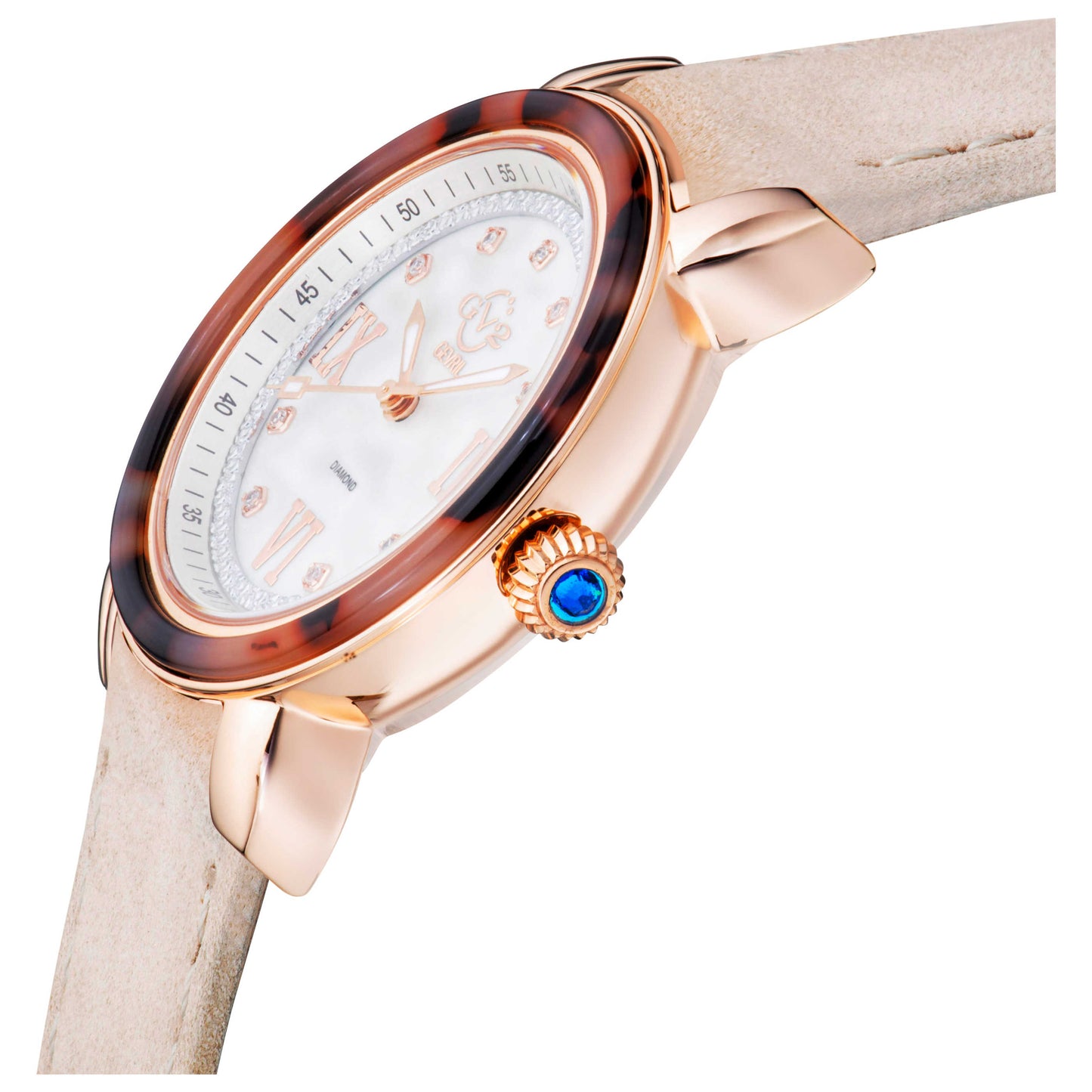 Introducing the GV2 by Gevril Marsala Tortoise, a Swiss-made marvel that redefines sophistication for the modern woman. Crafted in Switzerland with a precise quartz movement and housed in a stainless steel, round case, this watch features a stunning white mother-of-pearl dial. The scratch-resistant sapphire crystal with anti-reflective coating ensures durability, while the chic tan leather strap with a pin buckle offers both style and comfort. Perfect for daily wear or special occasions, this watch not only tells time but also tells a story of craftsmanship and style. 9853