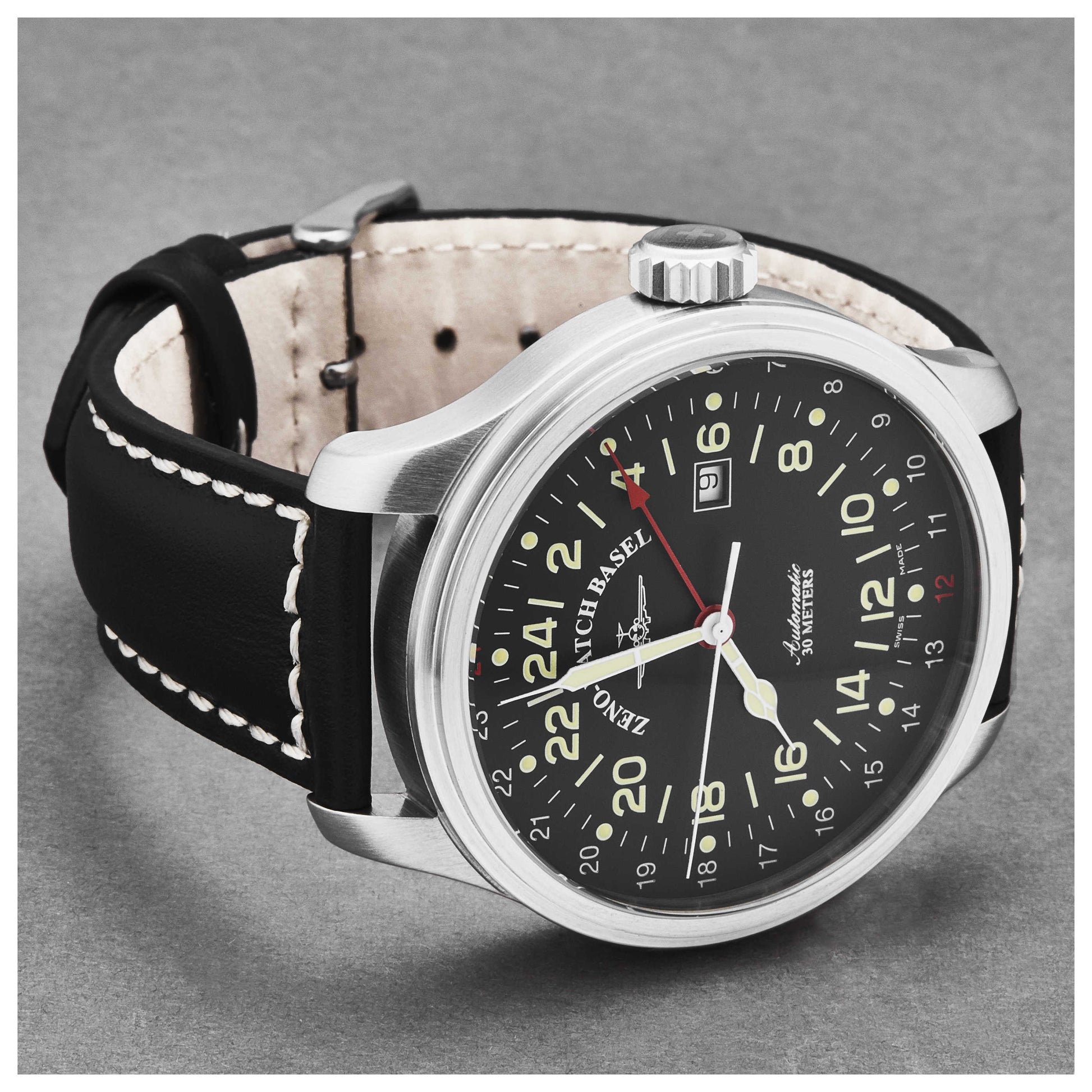 Embrace the rugged style of the Zeno OS Pilot watch, a must-have Swiss-made accessory for the adventurous man. Powered by an automatic SOP2424 movement, this robust round timepiece showcases a 47.5mm stainless steel case with an intriguing exhibition back. The black dial is safely shielded by a mineral crystal, ensuring the watch's 30m water resistance. Additionally, it features a date display for practicality. The black leather strap, perfectly complementing the overall aesthetics, secures with a reliable pin buckle. Designed with precision and sophistication, this watch is sure to make a strong impression. 8524-A1