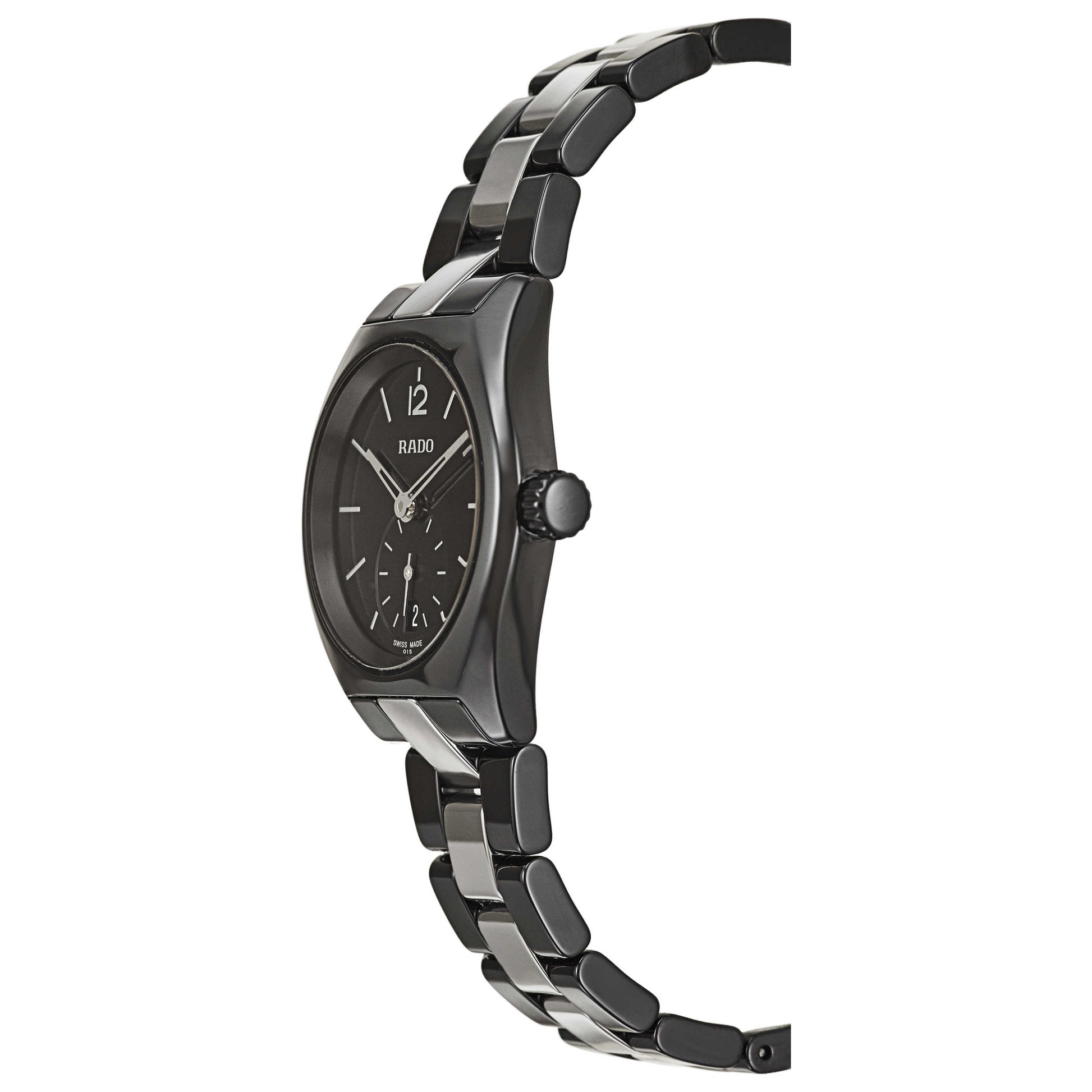 Introducing the Rado True Specchio watch, a striking accessory for the sophisticated woman. Designed in Switzerland, this quartz movement timepiece with caliber 256 combines durability and elegance. It showcases a sleek round case of 26.1mm, constructed from robust titanium and ceramic, protecting the Swiss-made movement within. Its pull and push crown and 50m water resistance ensure practical utility. You'll admire the chic black dial, highlighted with a date display at 6 o'clock, elegantly framed by scratch-resistant sapphire crystal. This masterpiece is completed with a black and silver titanium and ceramic bracelet featuring a secure deployment clasp. Stand out with this modern take on luxury. R27084157