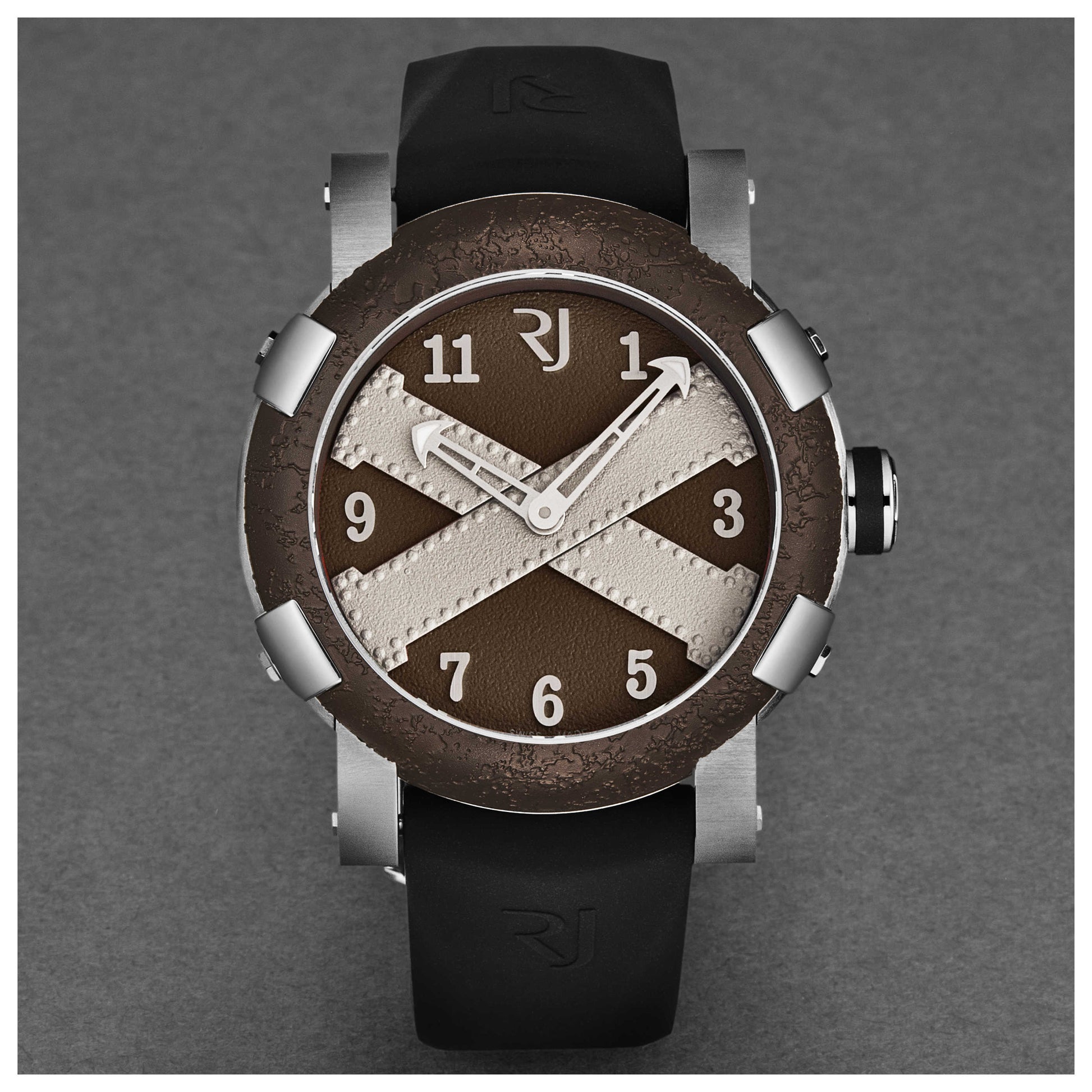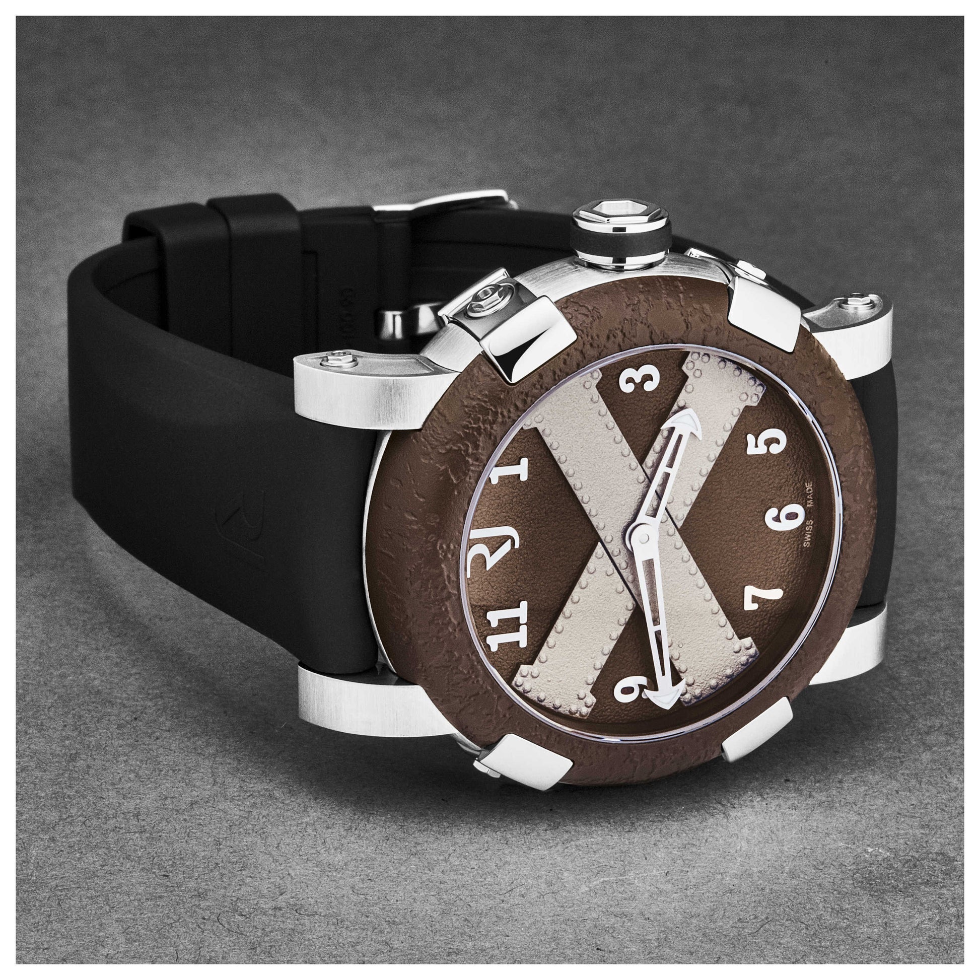 Unleash your bold style with the Romain Jerome Titanic A La Grande men's watch, a true Swiss masterpiece. This automatic movement timepiece features a round 46mm stainless steel case with a captivating brown dial, protected by a scratch-resistant sapphire crystal. Built with a closed back, it offers a water resistance of up to 30m, perfect for everyday wear. The watch is comfortably secured with a black rubber strap, which perfectly complements the design and ensures a snug fit with its pin buckle. An impressive addition to any collection, reflecting the undeniable allure of the deep seas. RJTGAU.301.10