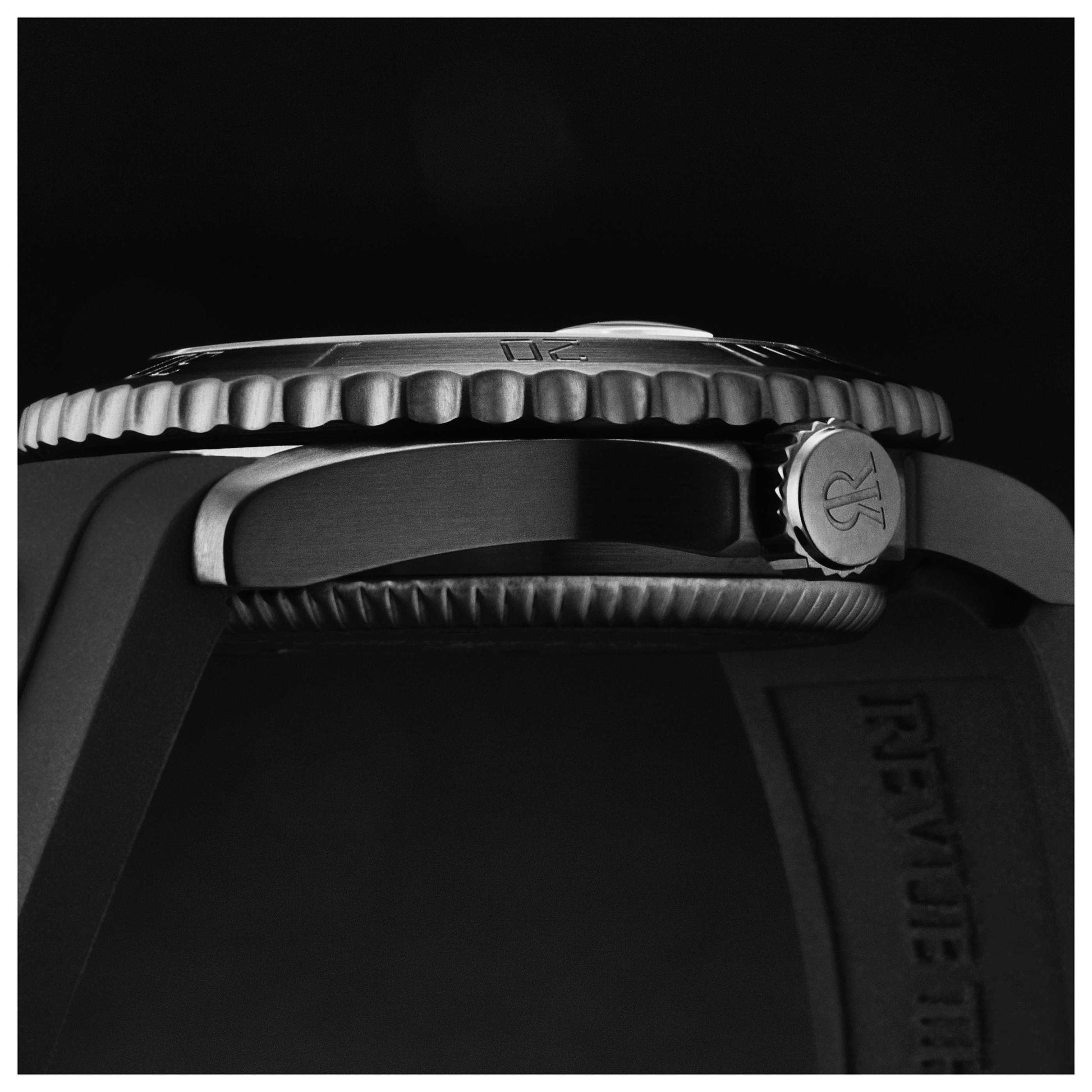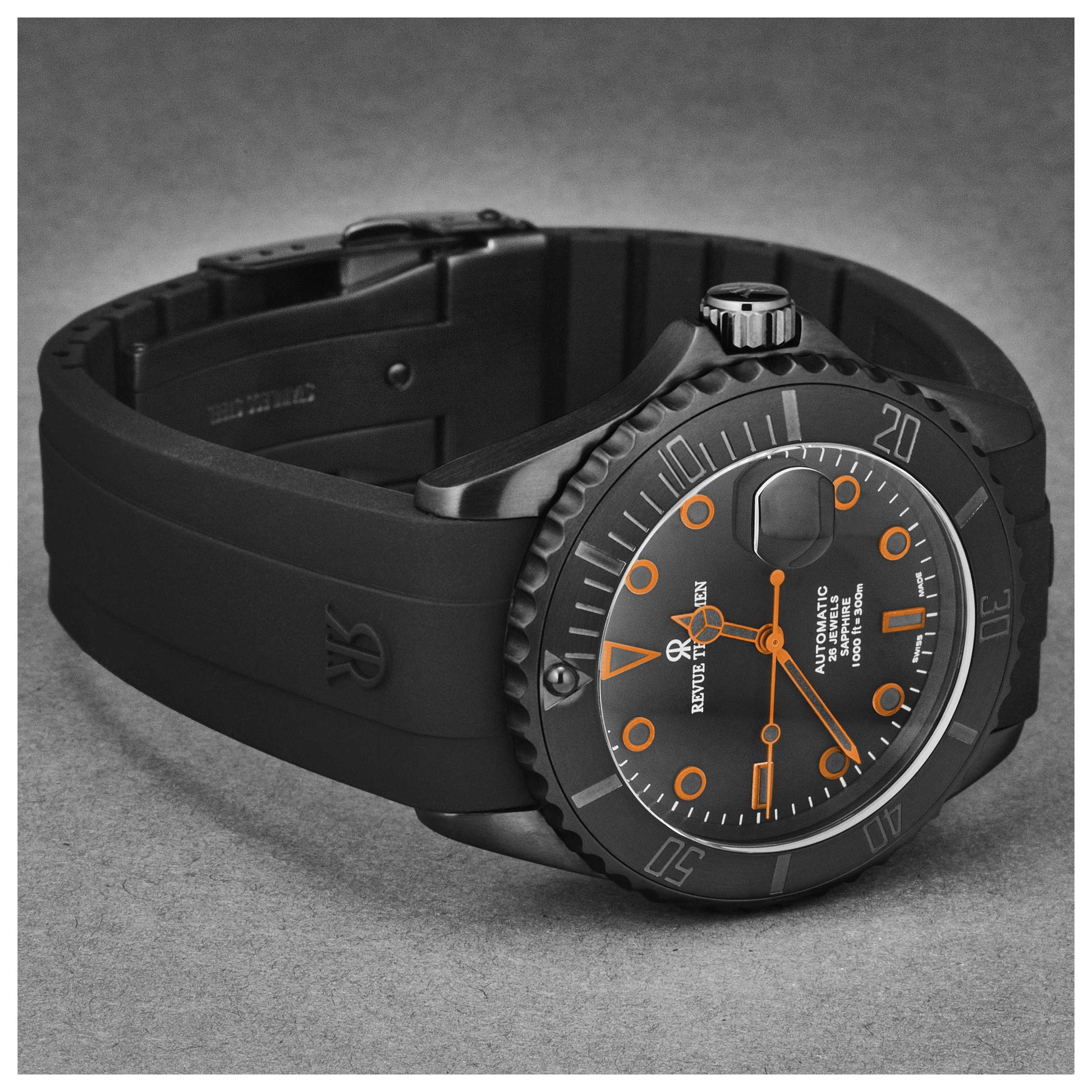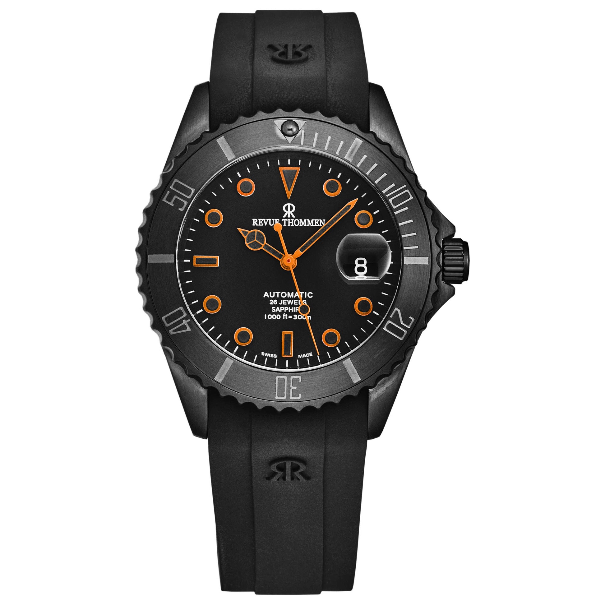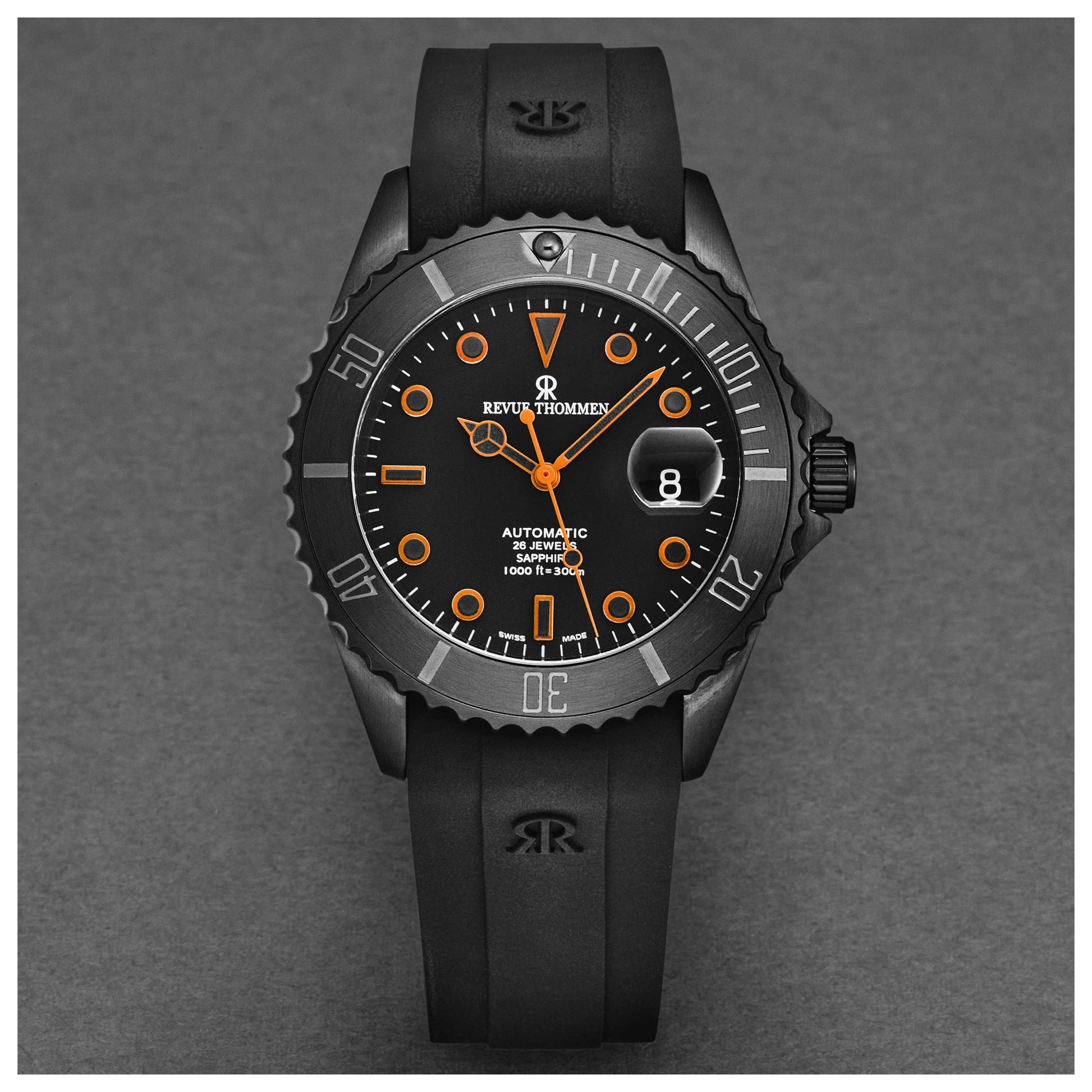 Enhance your collection with the Revue Thommen Diver watch, a robust companion for men who appreciate Swiss precision. This automatic timepiece, made in Switzerland, sports a screw-down crown and a substantial 38-hour power reserve. Nestled within the round 42mm black PVD stainless steel case is a black dial, safeguarded by a scratch-resistant sapphire crystal. The case back is closed for added protection, supporting a water resistance of up to 300m. Date feature included for added convenience. The black rubber strap, fastened by a deployment clasp, provides comfort without compromising on style. 17571.2779