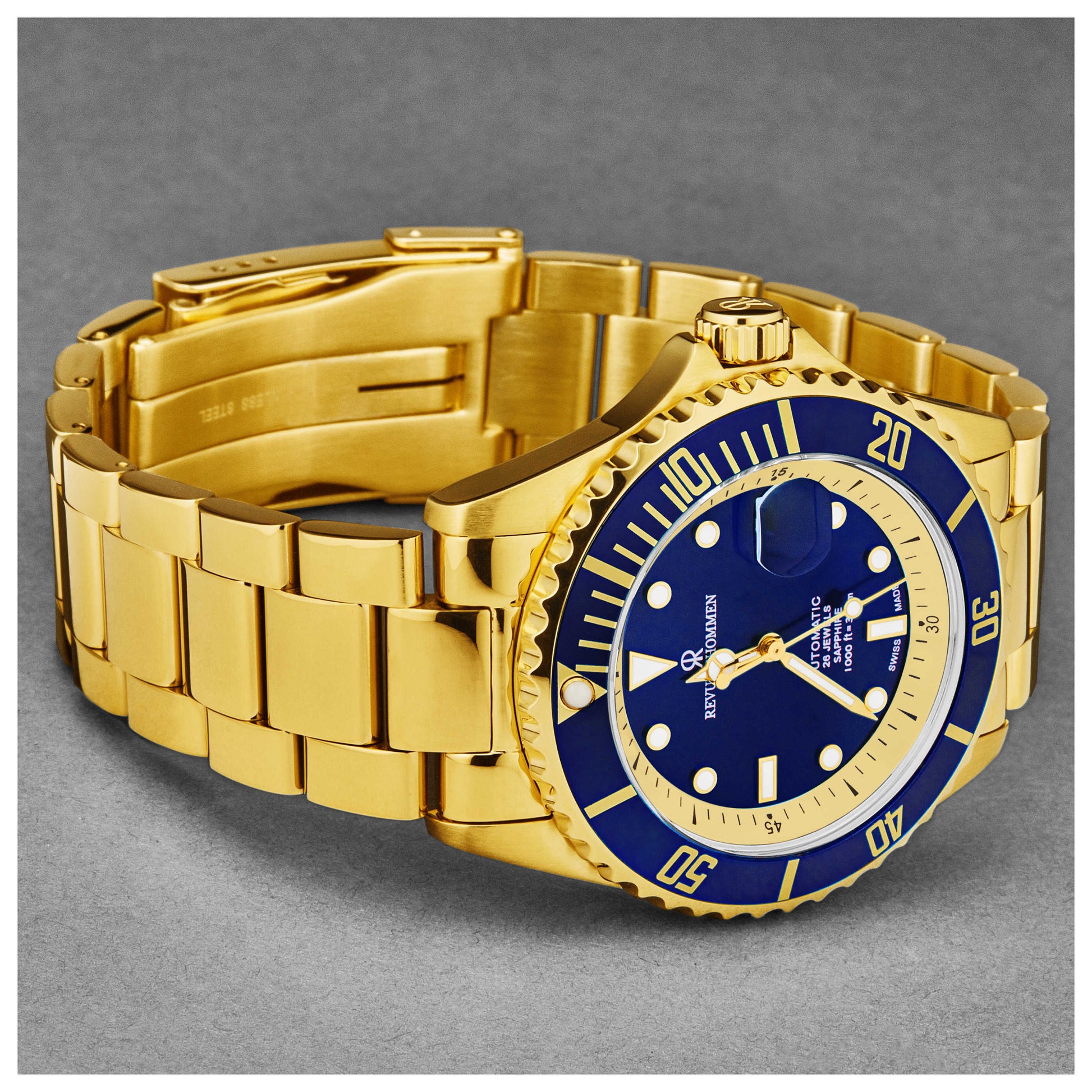 Discover the Revue Thommen Diver watch, a robust timepiece designed for the adventurous man. Swiss-made and featuring an automatic SW200 movement with a 38-hour power reserve, this round watch boasts a 42mm stainless steel case. It offers unbeatable durability with a scratch-resistant sapphire crystal, a closed back and a 300m water resistance. The vibrant blue dial comes to life under the crystal, and features a convenient date display. Complementing the robust casing is a gold-colored stainless steel bracelet with a deployment clasp. Experience Swiss quality and precision with this exceptional Diver watch from Revue Thommen. 17571.2415