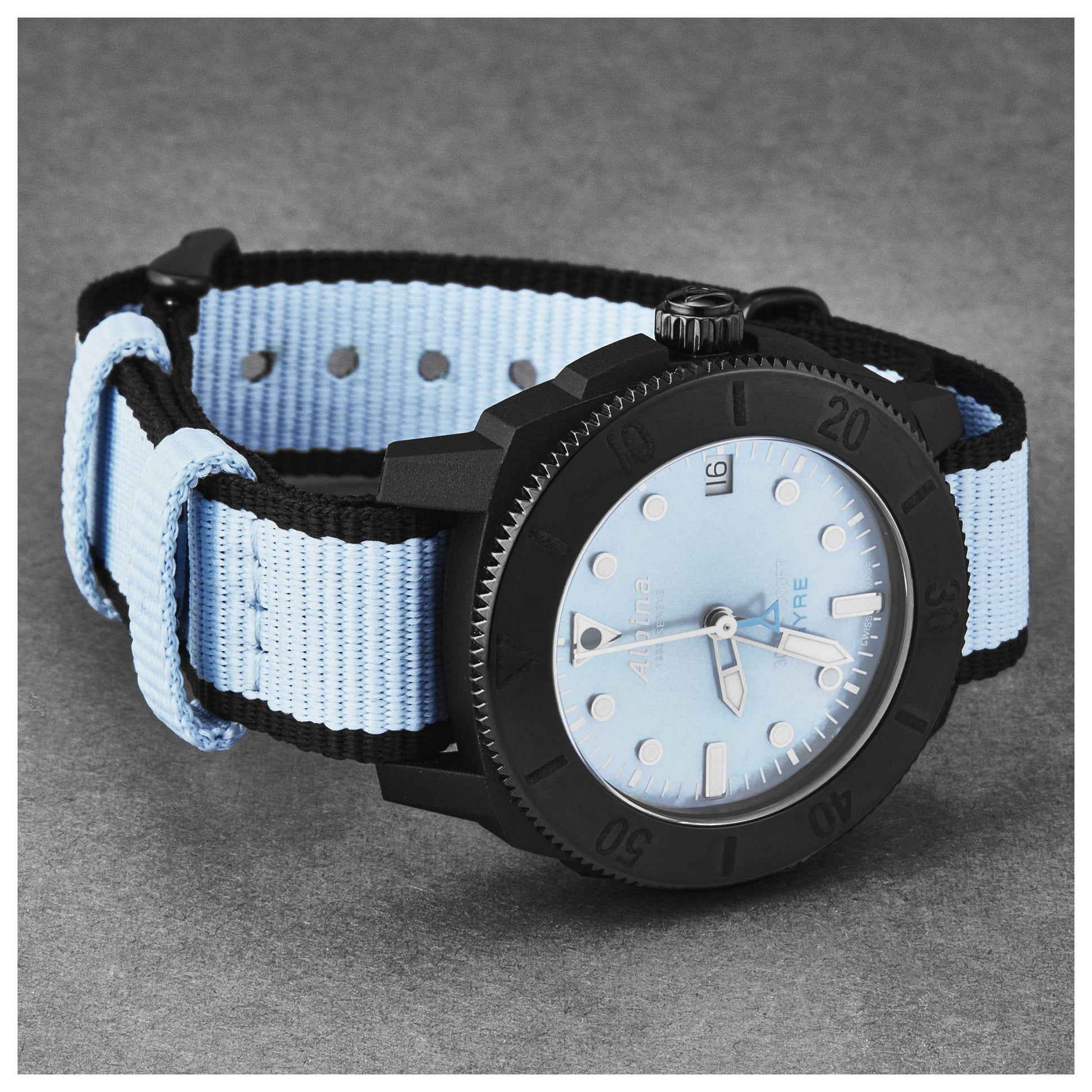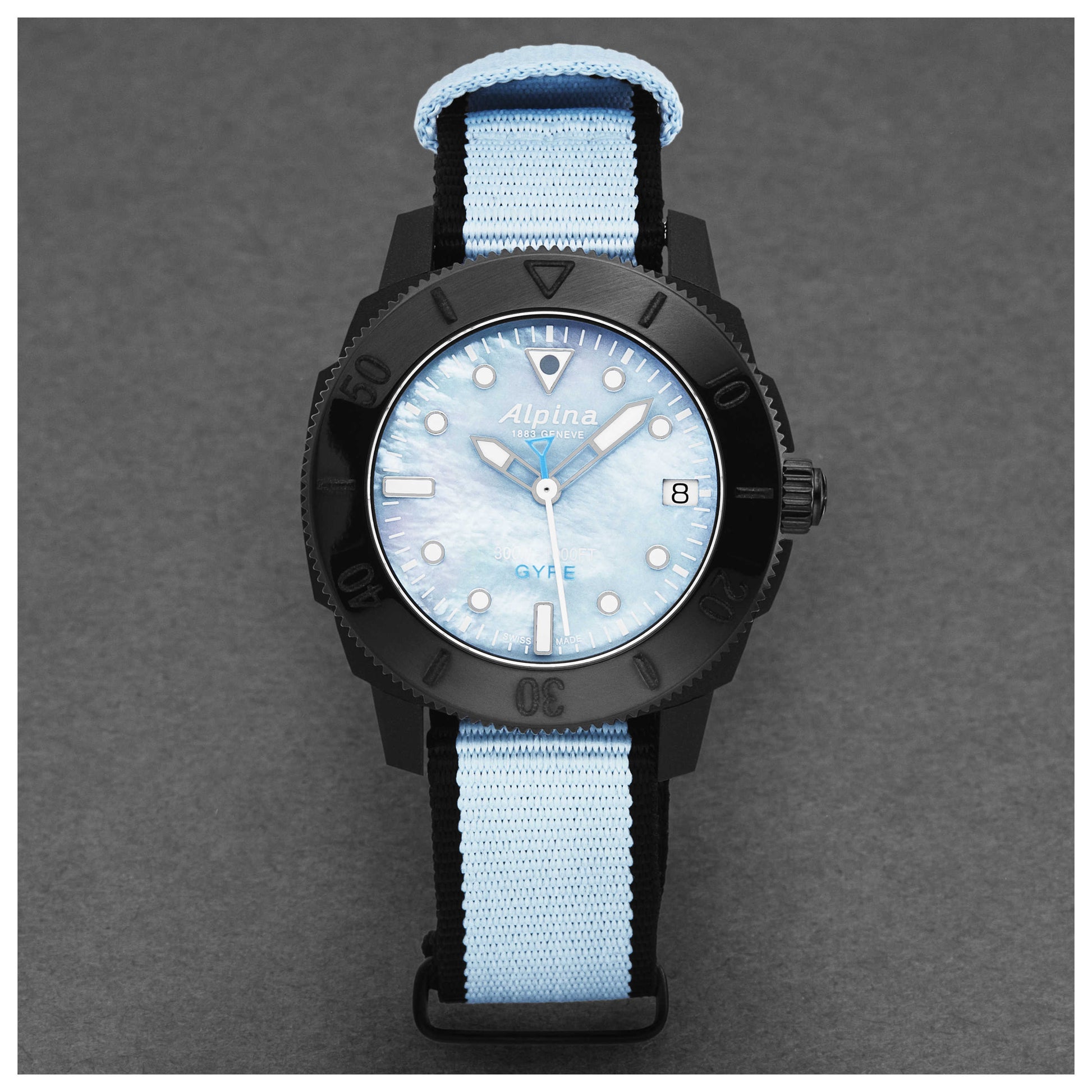 Discover the Alpina Seastrong Diver, a watch crafted with the modern, adventurous woman in mind. Swiss-Made with an automatic movement, this timepiece features a durable, round 36mm stainless steel case with a closed back. Protected by scratch-resistant sapphire crystal, the blue mother-of-pearl dial is highlighted with a practical date feature. The watch is fitted with a comfortable blue canvas strap that secures with a pin buckle. Engineered for precision and durability, it boasts a 300m water resistance and a screw-down crown. Originating from Switzerland, this watch embodies superior craftsmanship and style. AL525LMPLNB3VG6