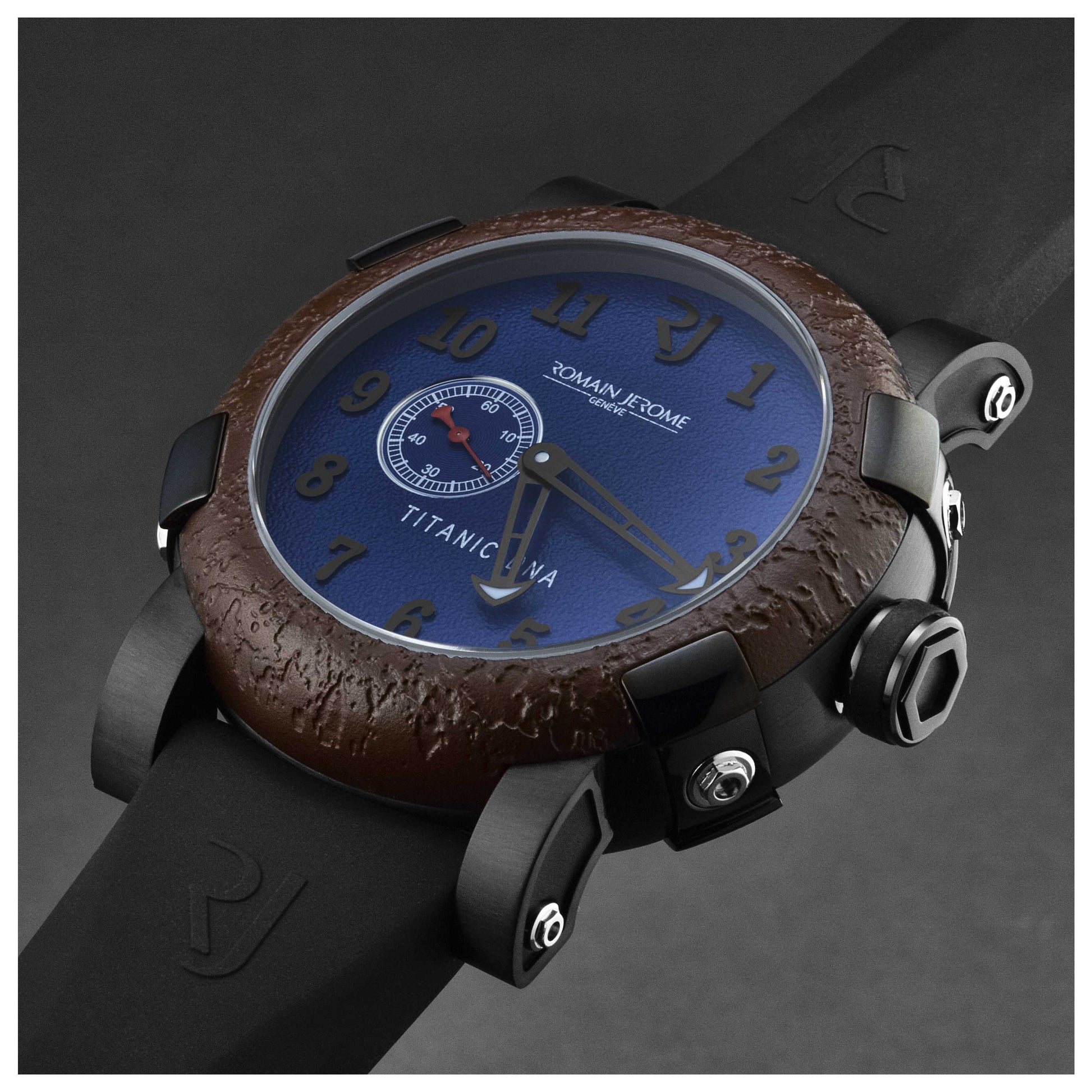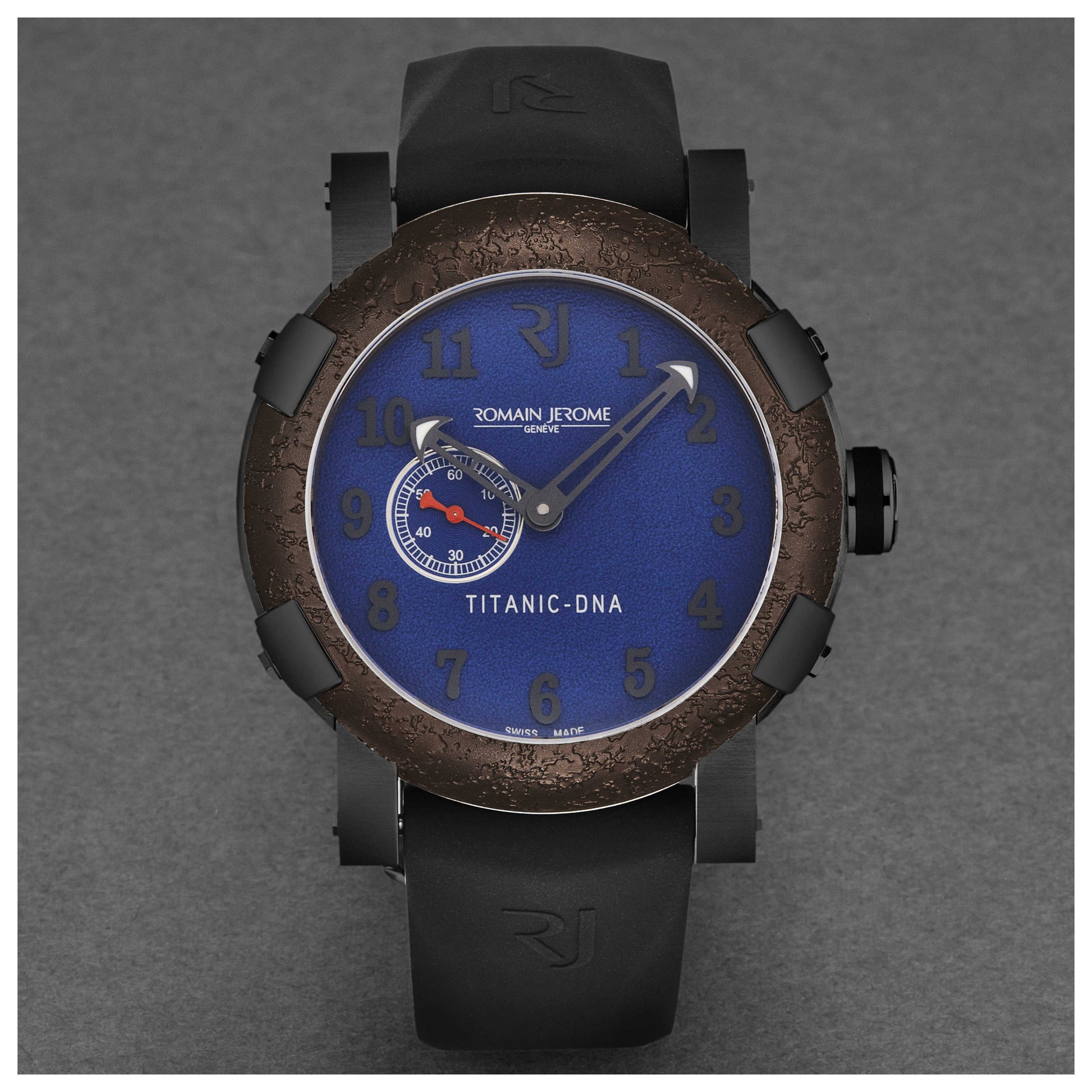 Exhibit sheer class with the Romain Jerome Titanic men's watch, a Swiss-made marvel drawing inspiration from history. This automatic movement timepiece, with a pull and push crown, is encased in a round 46mm black stainless steel case. Protected by scratch-resistant sapphire crystal and a closed back, the watch exhibits durability with water resistance up to 30m. The blue dial complements the black rubber strap impeccably, which ensures a secure fit with a pin buckle. For the man who appreciates craftsmanship and style, this is your timepiece. RJTIAU.502.20
