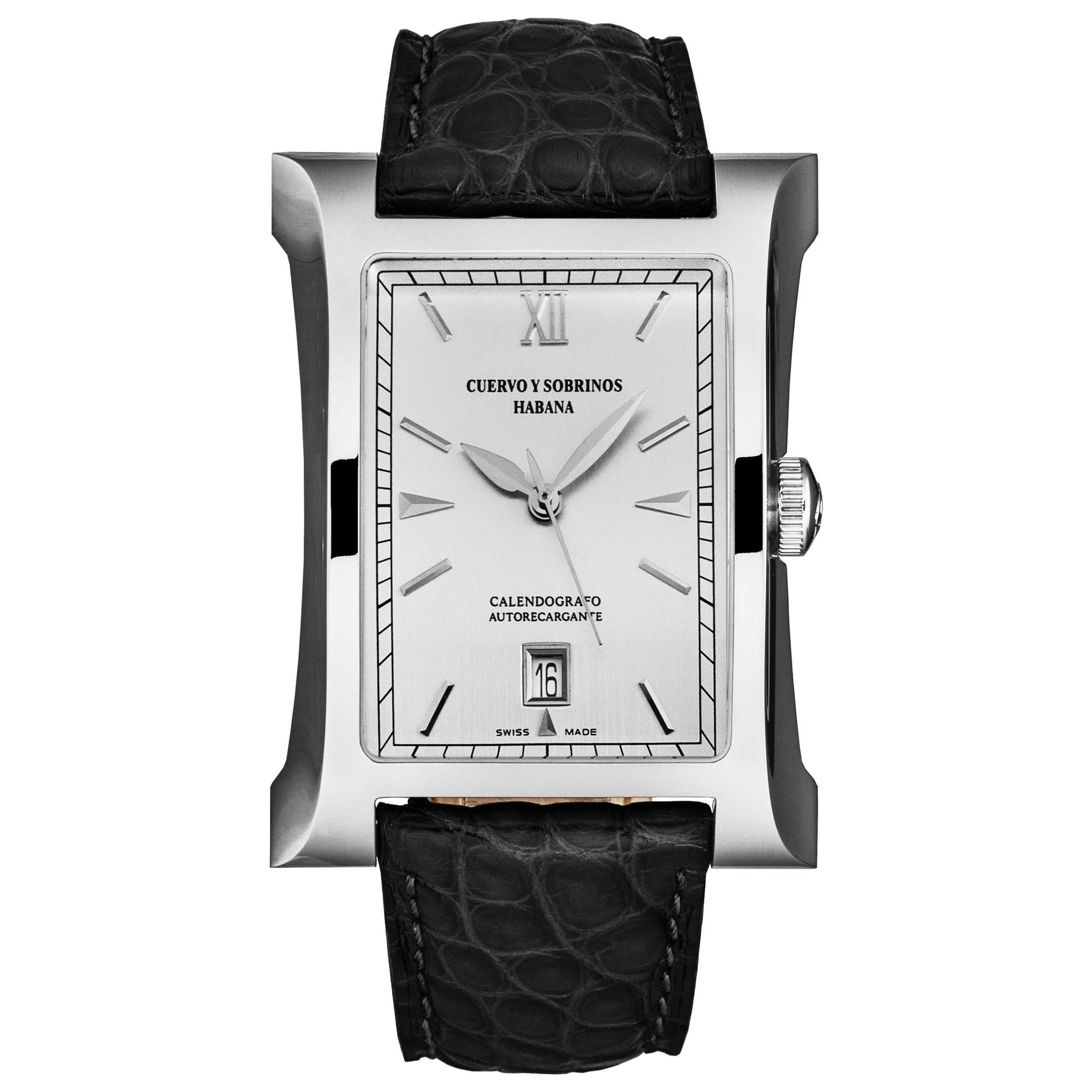Exude a sense of timeless elegance with the Cuervo y Sobrinos Espléndidos 1882 men's watch. Swiss-made with an automatic movement, this distinctive piece features a rectangular 35mm stainless steel case protected by scratch-resistant sapphire crystal. Underneath the silver dial, a convenient date feature adds to the watch's functionality, while the exhibition case back offers a peak into the precise workings of this remarkable timepiece. It's secured by a black leather strap with a reliable pin buckle. With a pull and push crown and 30m water resistance, this watch is both stylish and resilient. 2412.1AB