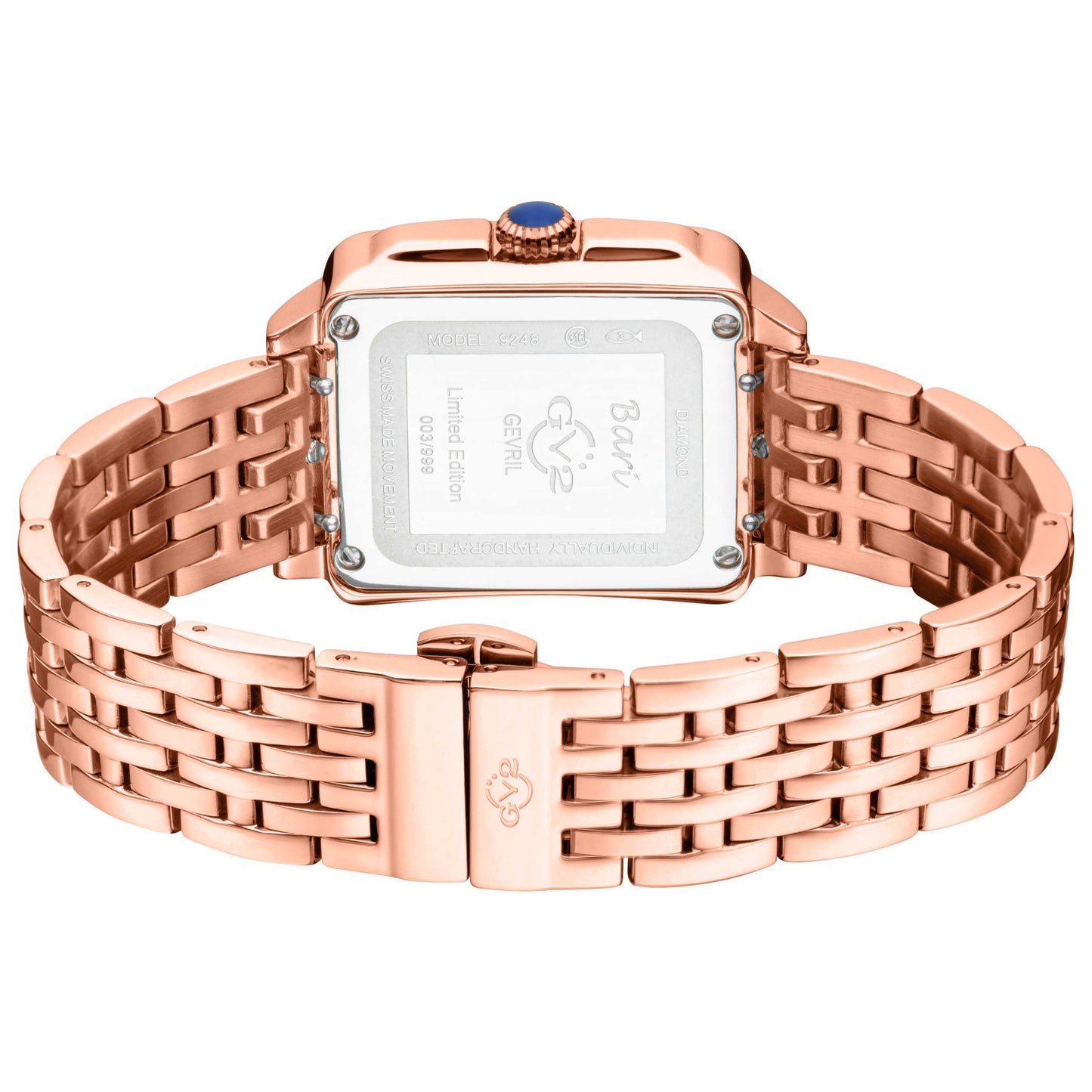 Enhance your elegance with the GV2 by Gevril Bari Tortoise watch, a symbol of Swiss sophistication crafted for women. Powered by a reliable quartz movement, this Swiss-made timepiece is encapsulated in a rectangular 30mm stainless steel case, providing 50m water resistance. It features an exquisite white mother-of-pearl dial, secured under an anti-reflective, scratch-resistant sapphire crystal. The stylish rose gold stainless steel bracelet, with its secure deployment clasp, perfectly complements the overall look of the watch. Enjoy effortless time adjustment with the pull and push crown. Truly a class apart! 9245B