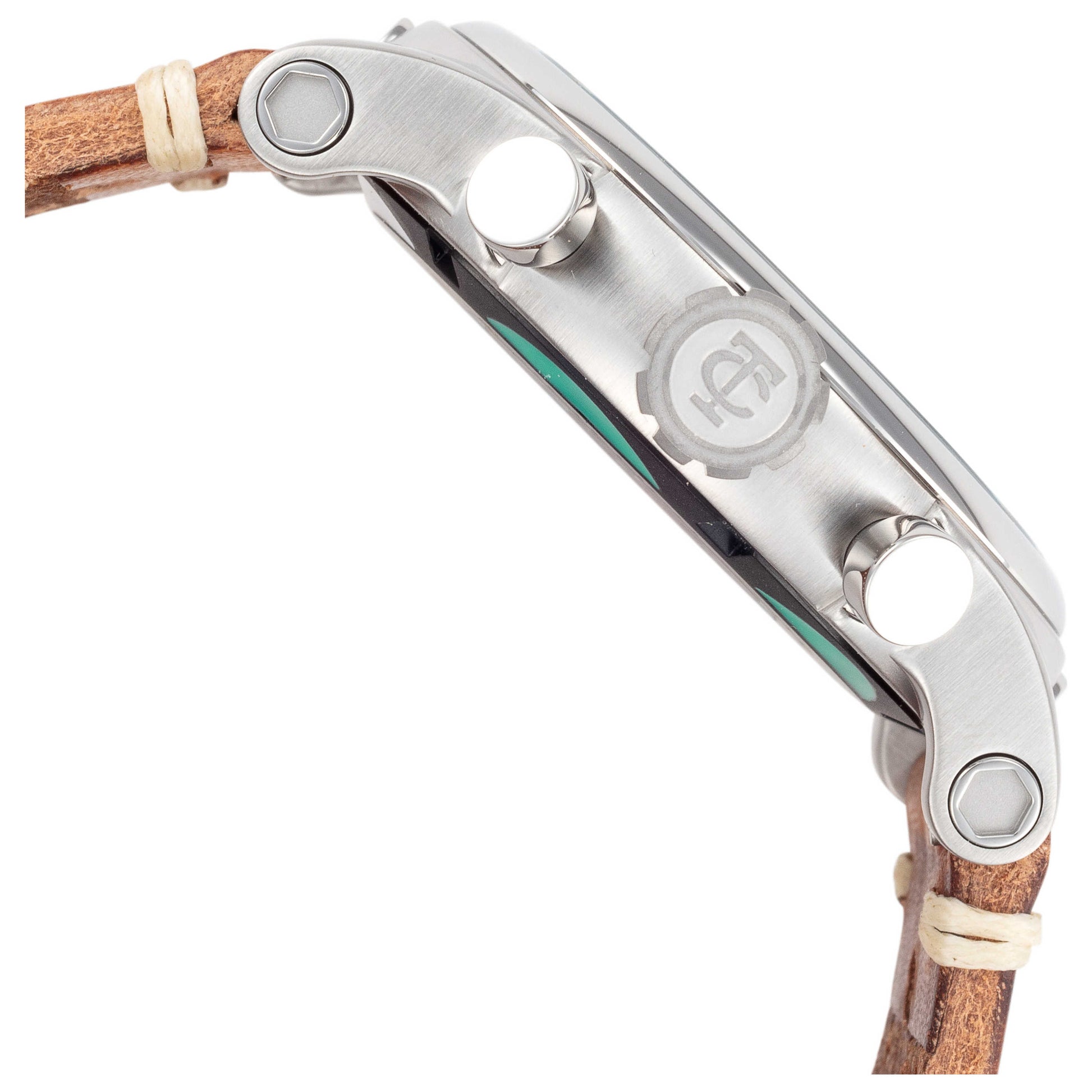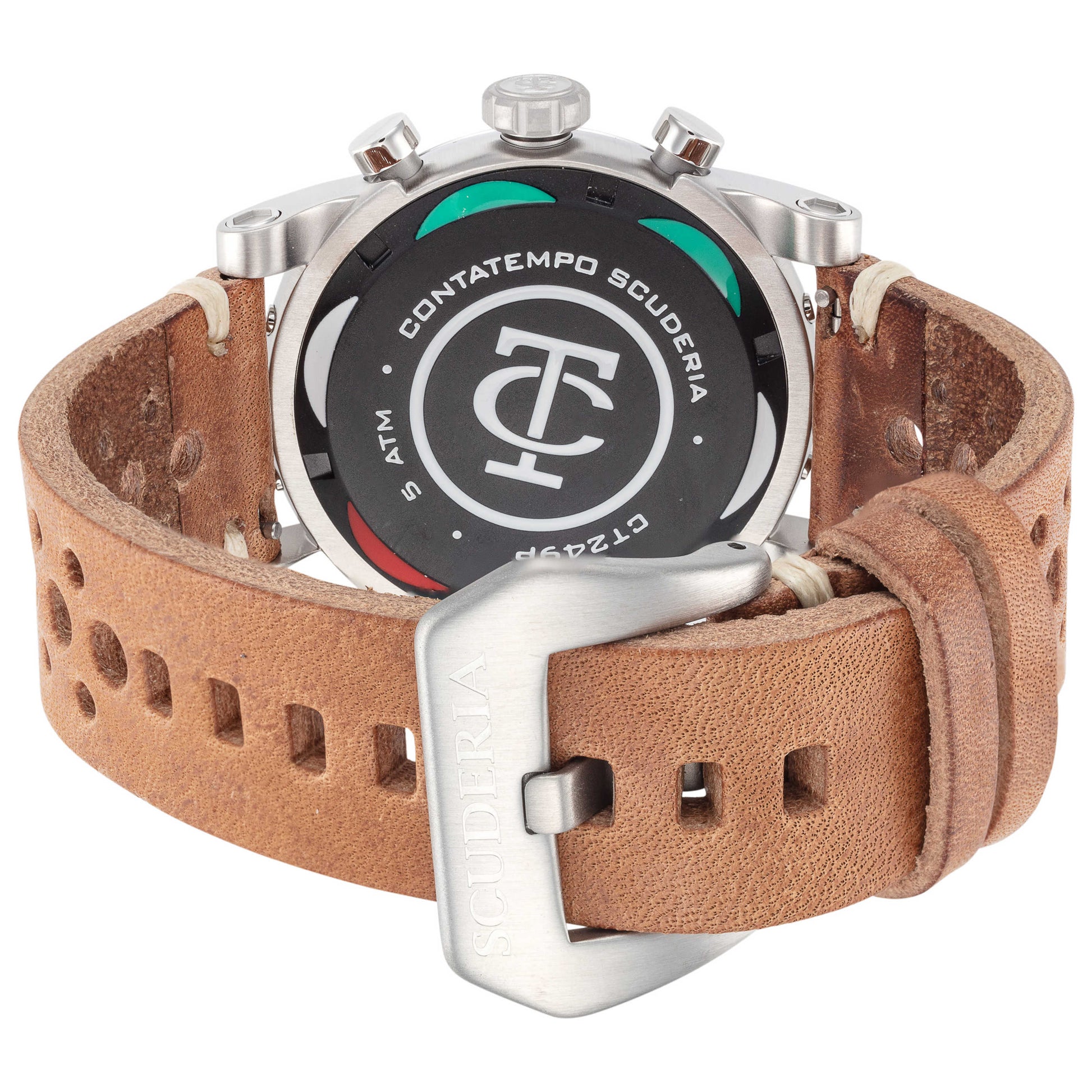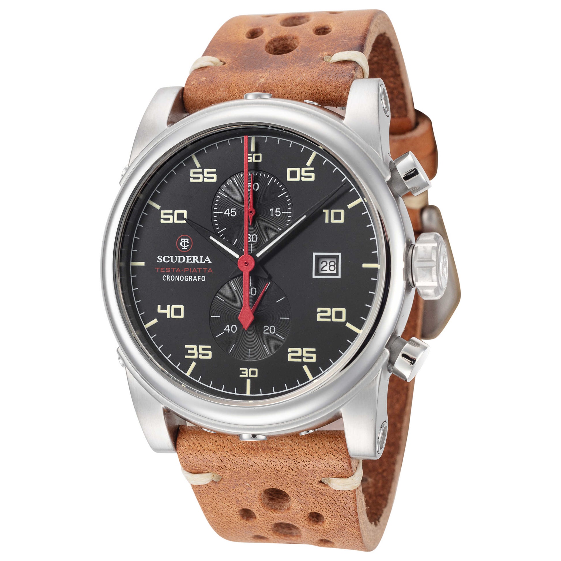 The CT Scuderia Testa Piatta men's quartz watch includes a black dial with chronograph features and a round stainless steel case of 42 mm. The mineral crystal case back is closed, offering 50 m (165 feet) water resistance. A Japanese-made Miyota 0S11 movement powers the watch and includes a screw-down crown for added protection. This timepiece also has an attractive brown leather strap with pin buckle closure to complete its look.