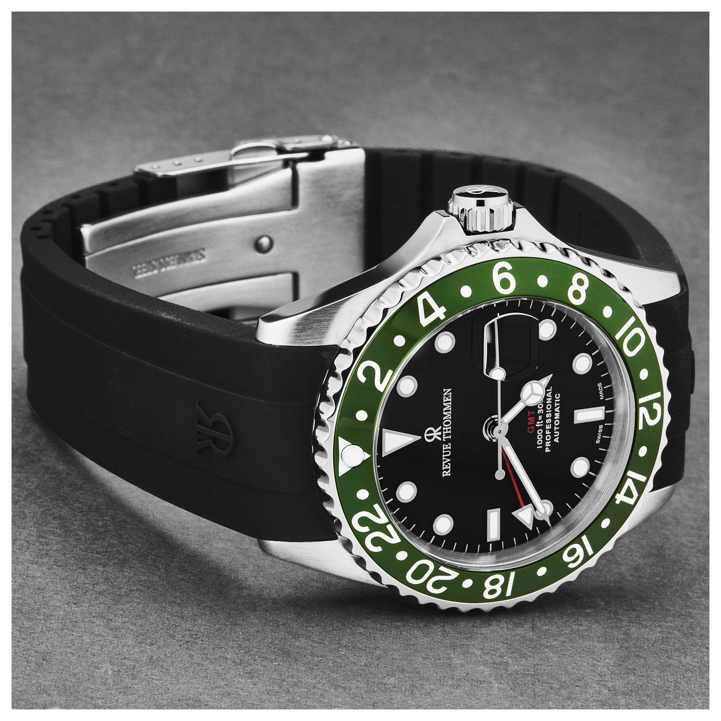 Explore new depths with the Revue Thommen Diver watch, meticulously crafted in Switzerland for the adventurous man. This automatic movement watch features an impressive 42-hour power reserve and a screw-down crown for enhanced water resistance up to 300m. Housed in a 42mm stainless steel case, the black dial sports date and GMT functions beneath a scratch-resistant sapphire crystal. With an exhibition case back, watch your timepiece at work. This men's watch comes with a sturdy black rubber strap that fits securely with a deployment clasp, adding an edgy touch to your rugged adventures. 17572.2834