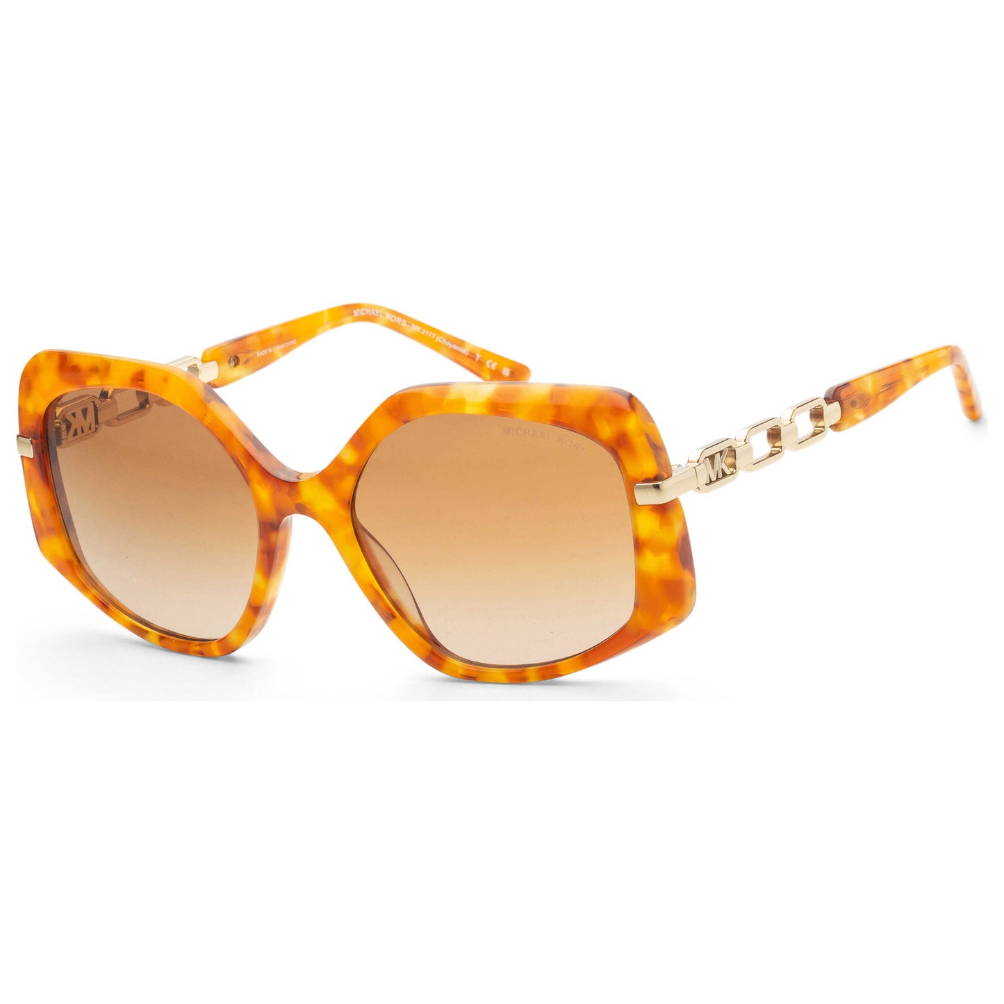 Introducing Michael Kors' Cheyenne sunglasses, a women's must-have for chic, sun-safe fashion. Crafted from sturdy acetate, these geometric frames in marigold tortoise and brown gradient lenses, offer 100% UV protection. With a 56 mm lens width, experience a blend of style and security with Cheyenne's modern allure. MK2177-39153B