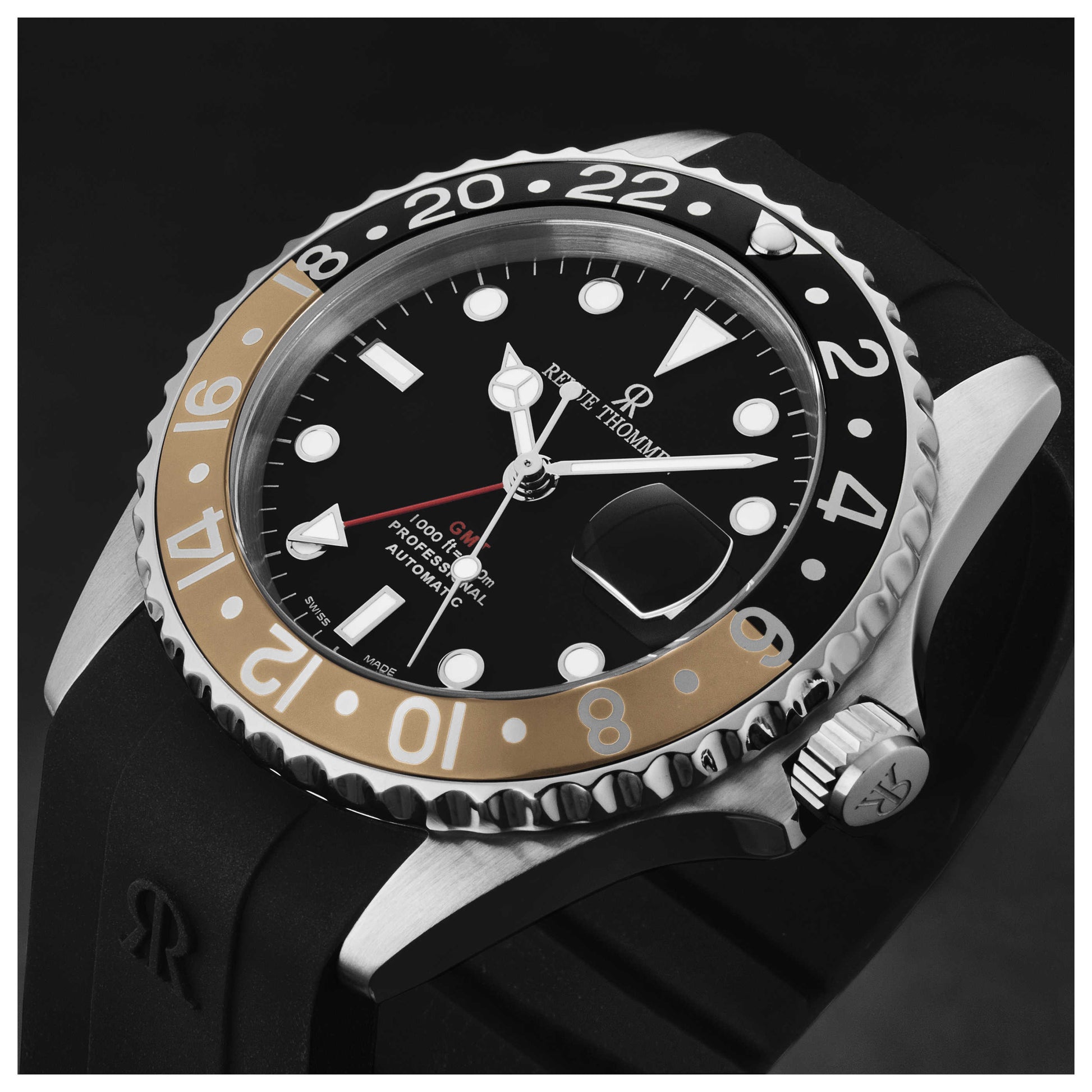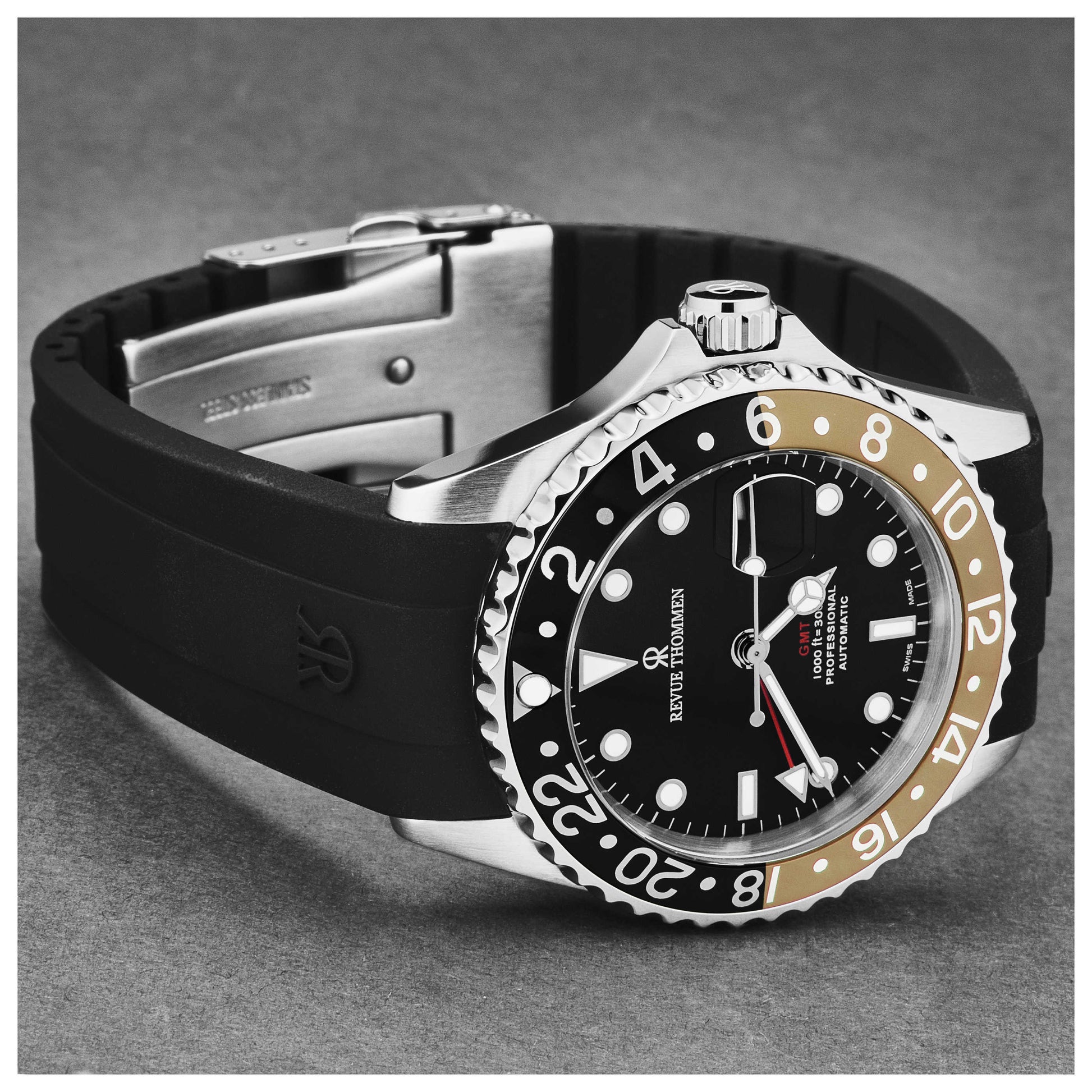 Immerse in the underwater world with the Revue Thommen Diver watch, a Swiss-made essential for the adventurous man. This automatic timepiece features a robust 42mm stainless steel case and a black dial protected by scratch-resistant sapphire crystal. With its screw-down crown and impressive water resistance of 300m, it's perfect for your deep-sea expeditions. The exhibition case back gives a peek into the watch's intricate mechanisms. The GMT and date features provide added functionality. The watch is complemented by a sturdy black rubber strap with a deployment clasp, ensuring a snug fit for all your adventures. 17572.2832