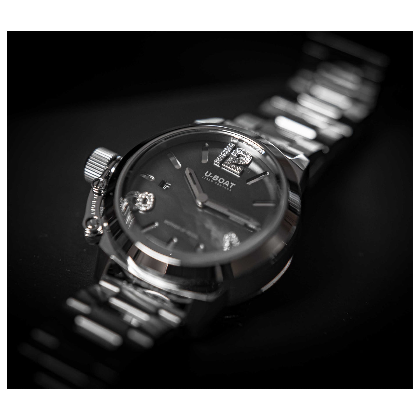 Step out in style with the U-Boat Classico watch, an exquisite piece designed for the modern woman. This Italian-made accessory features a quartz movement that is Swiss-Made, ensuring reliable timekeeping. Its round 30mm stainless steel case is home to a striking black mother-of-pearl dial, protected by a scratch-resistant sapphire crystal. With a water resistance of 50m and a closed back, it is both practical and durable. The watch is completed with a sleek silver stainless steel bracelet, fastening securely with a deployment clasp. The release lever crown offers easy adjustments, enhancing the overall functionality of this elegant timepiece. UB-8899