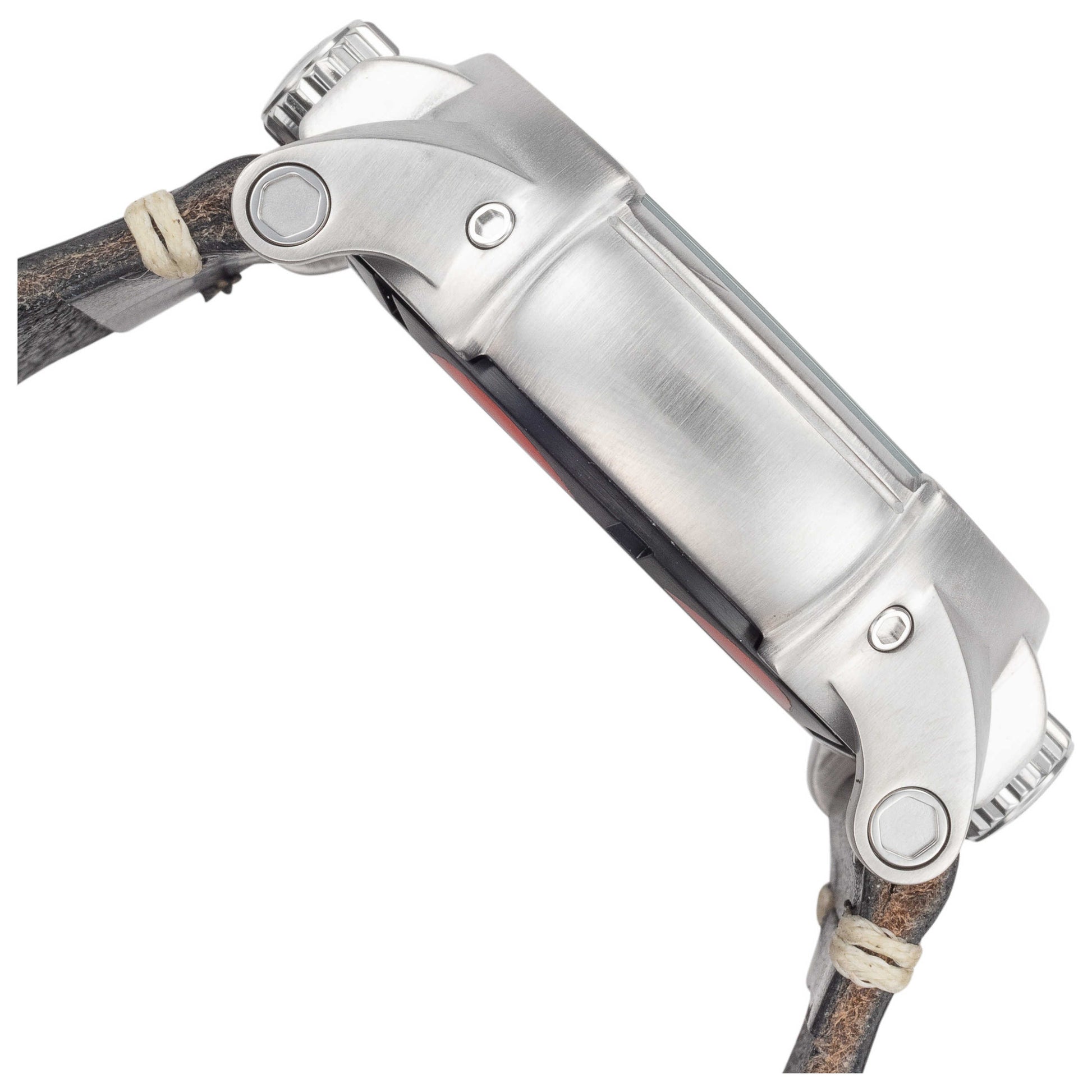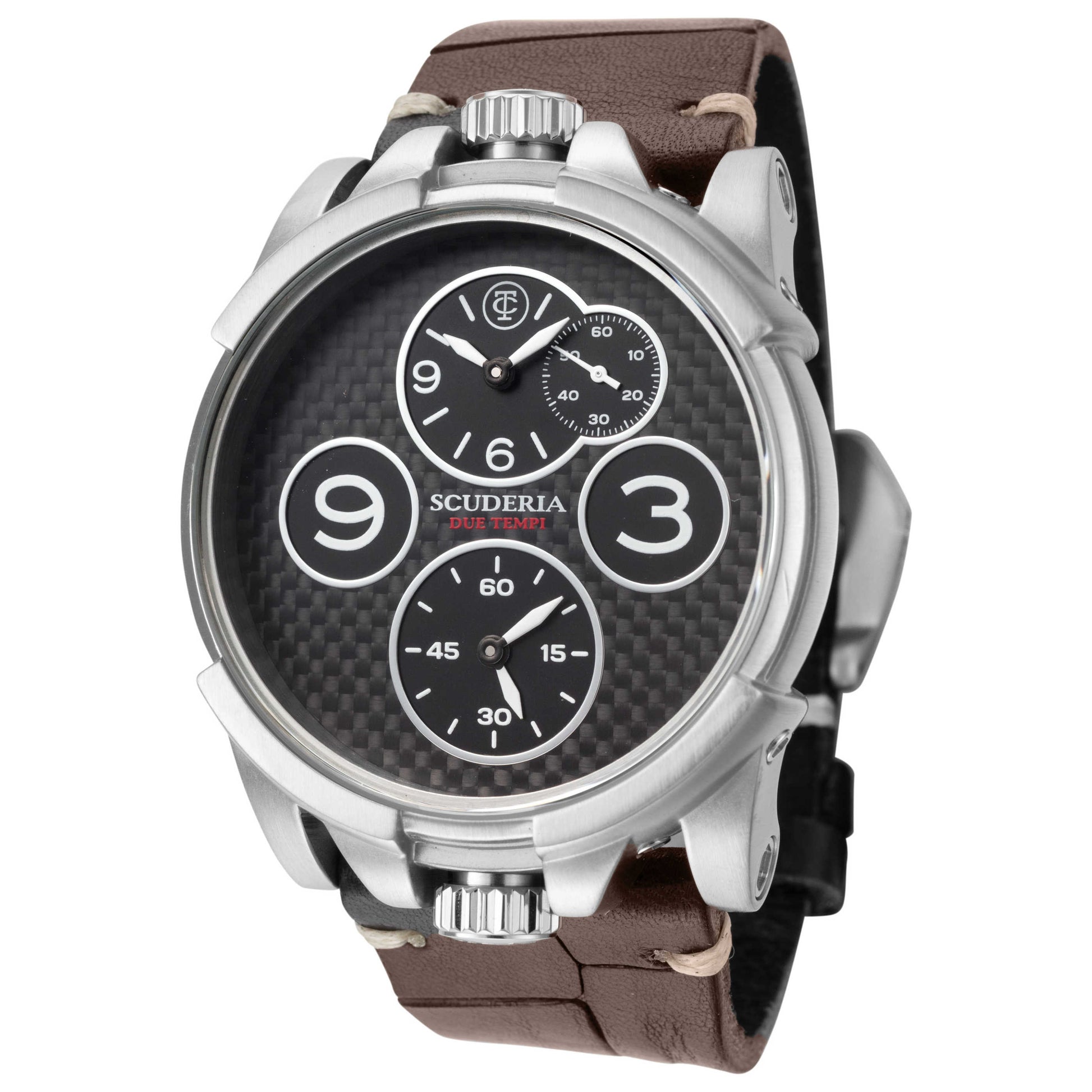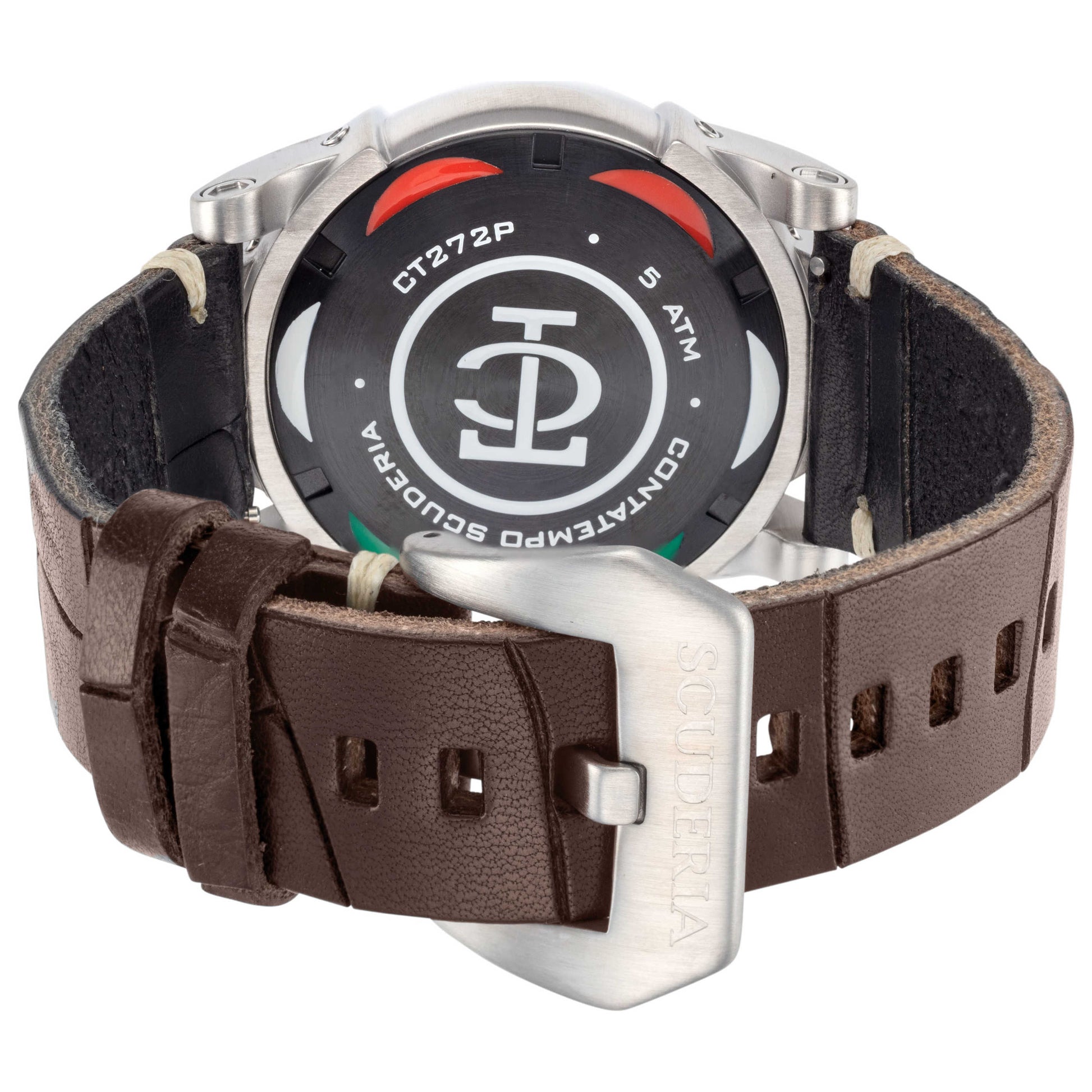 Introduce timeless elegance to your collection with the CT Scuderia Due Tempi Men's watch. This Japanese-made quartz timepiece features a dual time function, courtesy of its Miyota 1L45 and Miyota 2025 calibers, managed with a reliable screw-down crown. The round 44mm stainless steel case boasts a mineral crystal front and a closed back for durability, withstanding water depths up to 50m. A sleek black dial pairs flawlessly with the black leather strap, secured with a pin buckle, to add a classic touch to any attire. CT-272-P