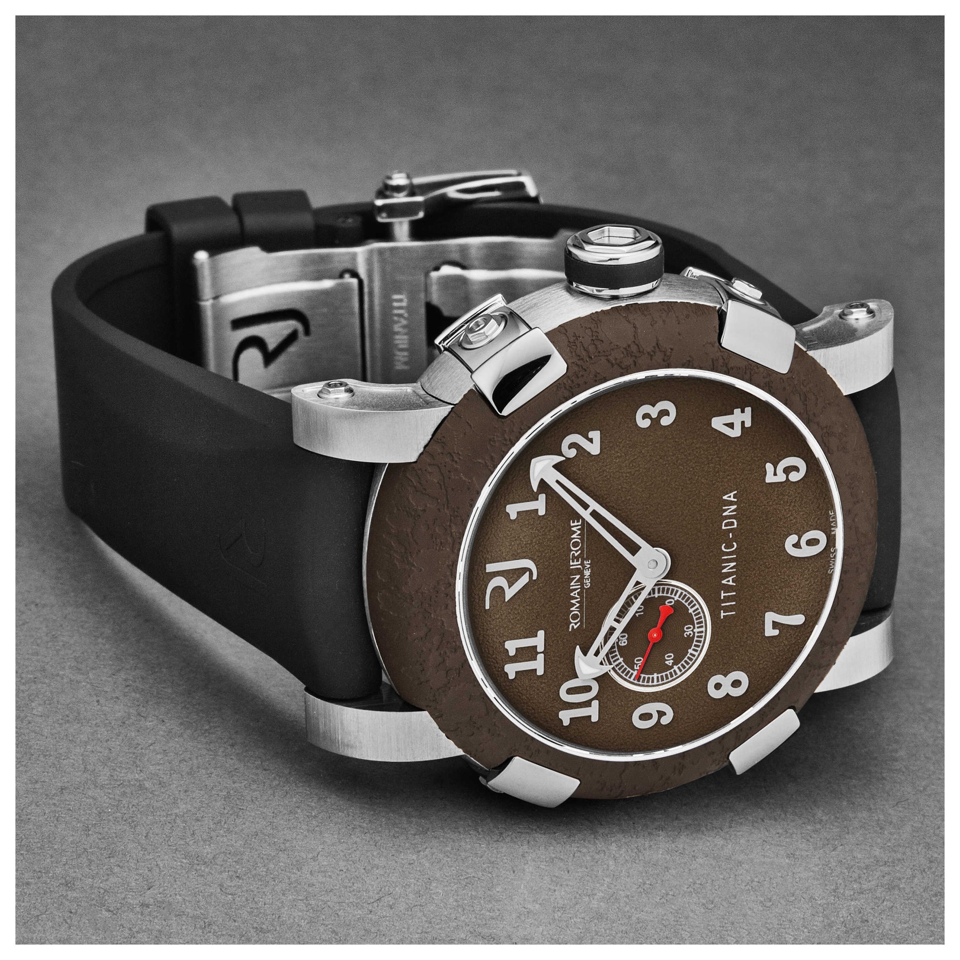 Introducing the Romain Jerome Titanic watch, a distinctive piece designed exclusively for men who value quality and craftsmanship. Expertly crafted in Switzerland, this automatic timepiece showcases a 46mm stainless steel case with a brown dial, protected by a scratch-resistant sapphire crystal. The closed case back ensures durability, while the pull and push crown allows for easy adjustments. Boasting a water resistance of up to 30m, this Swiss-made watch perfectly balances style and functionality. The watch is completed with a black rubber strap, secured by a deployment clasp for a comfortable and secure fit. RJTIAU.301.10