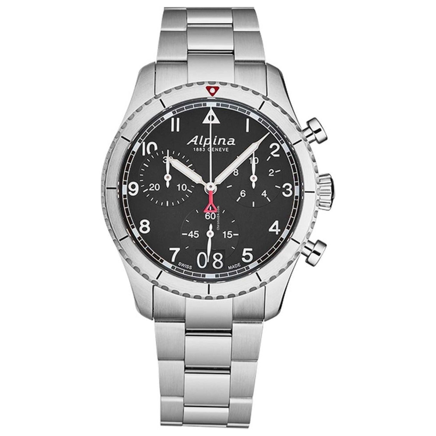 Make every second count with the Alpina Smartimer Pilot Men's Chronograph. Crafted in Switzerland, this timepiece features a durable stainless steel bracelet with a deployment clasp, and a scratch-resistant sapphire crystal. It's powered by a Swiss-made quartz movement, housed in a 41mm round stainless steel case, and offers water resistance up to 100m (330 feet). The black dial complements its robust design, making it a perfect companion for every adventure. AL372BW4S26B