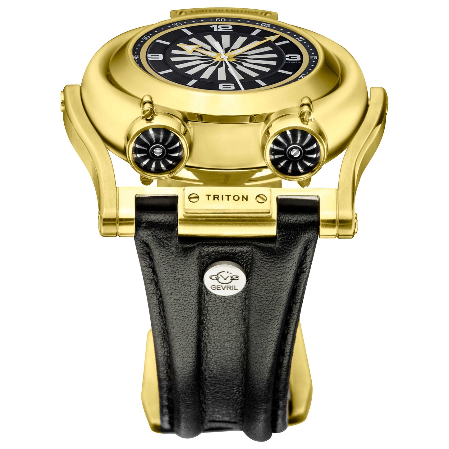 Sport the GV2 by Gevril Triton watch, a premium timepiece designed for the sophisticated man. This Swiss-made automatic watch, encased in a 49mm stainless steel round case, stands up to the demands of active lifestyles with a screw-down crown and a water resistance of up to 50m. Its striking black dial, guarded by a scratch-resistant, anti-reflective sapphire crystal, makes a bold statement. Secured with a pin buckle, the black leather strap adds a touch of masculine elegance, rounding out this robust and stylish timepiece. 3408