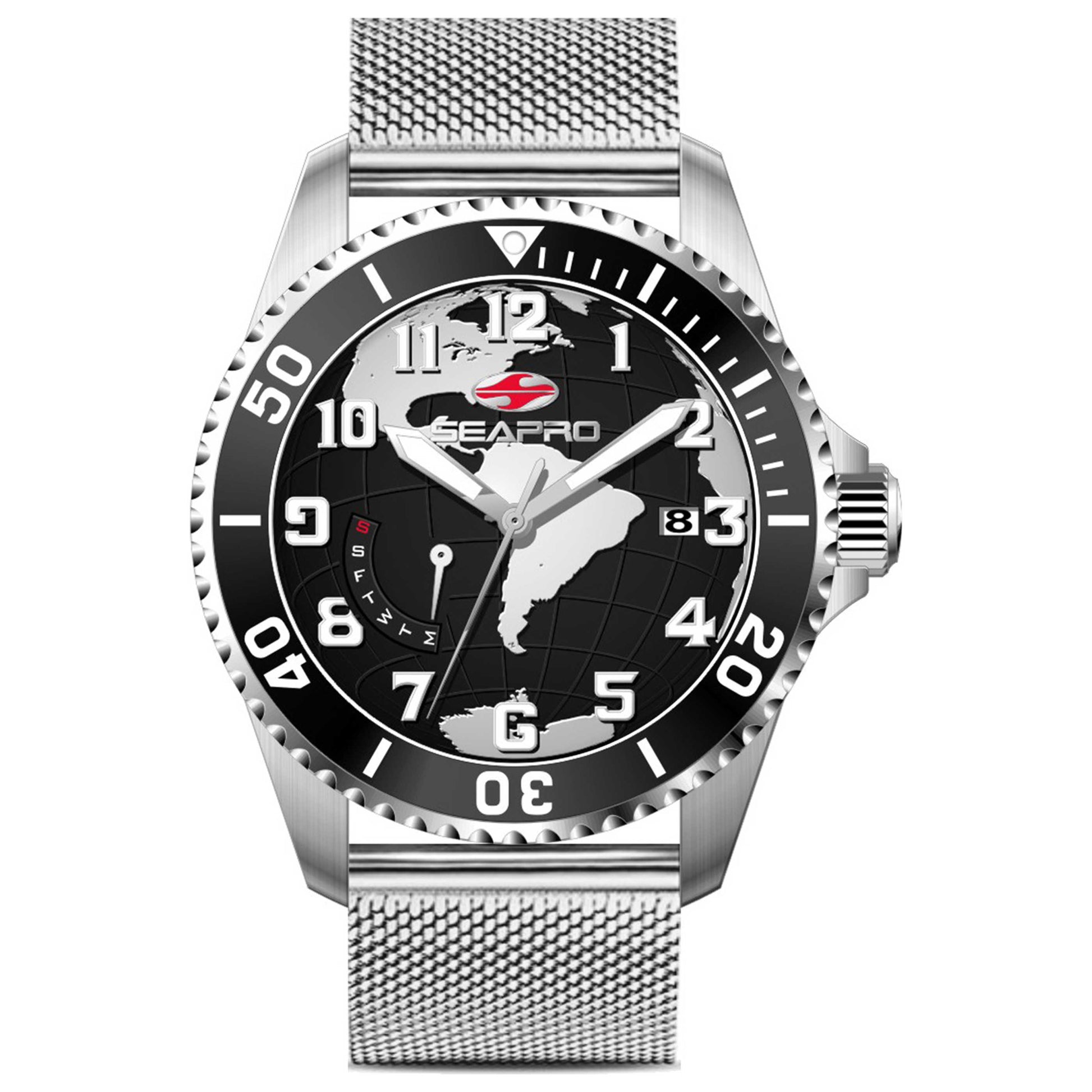 Presenting the Seapro Voyager, a men's watch designed to navigate life's adventures. The quartz movement timepiece features a robust 42mm stainless steel case safeguarded by a scratch-resistant mineral crystal. Its screw-down crown and impressive water resistance up to 200m make it a reliable partner in aquatic endeavours. The black dial provides a stark contrast to the silver stainless steel bracelet, which fastens securely with a pin buckle. This round watch from the Voyager collection offers a perfect balance between functionality and style. SP4761