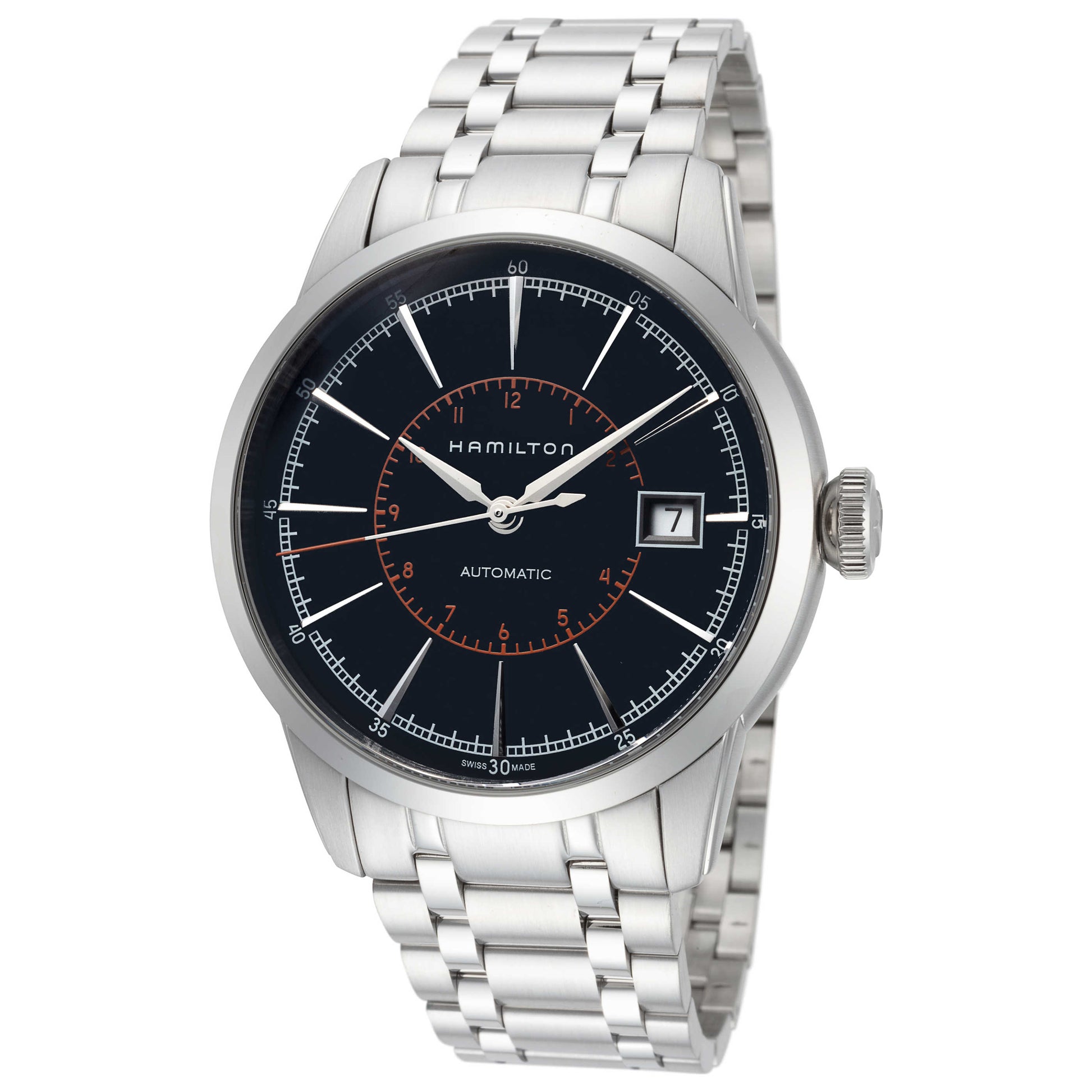 Discover the American Classic from Hamilton, a men's watch steeped in timeless style. Made in Switzerland, this automatic, H-10 movement timepiece boasts a generous 80-hour power reserve. The round, 40mm stainless steel case houses a black dial with a date display at 3 o'clock, shielded by a scratch-resistant sapphire crystal. The exhibition back reveals the watch's intricate mechanics. Comfortably encased in water resistance of 50m, the watch has a sleek silver stainless steel bracelet, fastened securely with a deployment clasp. Its pull and push crown makes setting the time effortless. H40555131