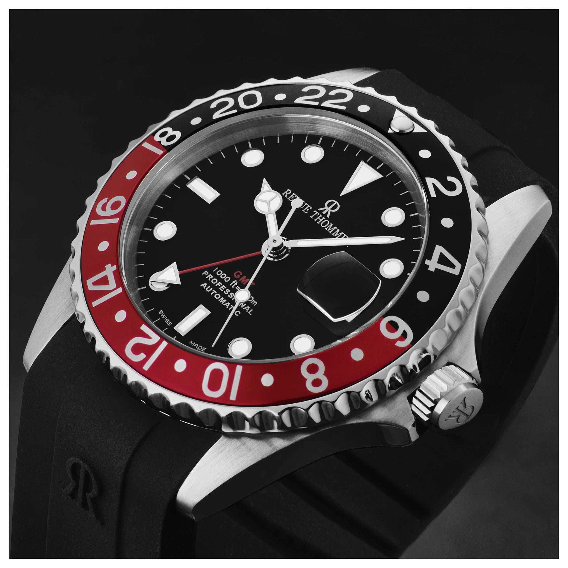 Indulge in the Revue Thommen Diver watch, a stylish accessory for the modern man. This men's Swiss-made automatic watch showcases an impressive 42 hours power reserve and boasts a screw-down crown. The watch presents a round 42mm stainless steel case with a black dial, protected by a scratch-resistant sapphire crystal and enhanced with a GMT and date feature. Encased in an exhibition back, it assures robust water resistance up to 300m. The black rubber strap offers comfort and durability while ensuring a secure fit with its deployment clasp. A superb combination of function and elegance, this watch is truly a masterpiece. 17572.2836