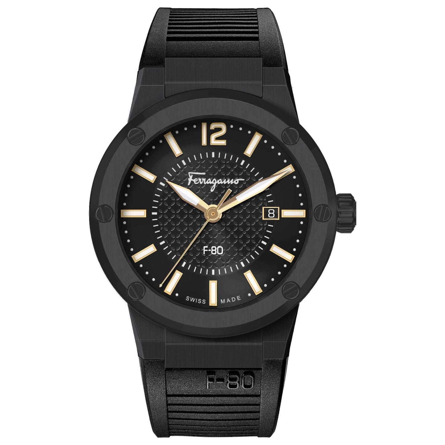 Discover the Ferragamo F-80 men's watch, an impressive timepiece crafted in Switzerland. This high-performance accessory features a robust quartz movement enclosed in a black, 44mm stainless steel round case. The black dial, under the scratch-resistant sapphire crystal, showcases a practical date feature, adding to its Swiss-made sophistication. Engineered for durability, this watch includes a pull and push crown and boasts a water resistance of 100m. Its black silicone strap with a secure pin buckle lends a sporty appeal, ensuring this watch is as stylish as it is functional. SFHY01622