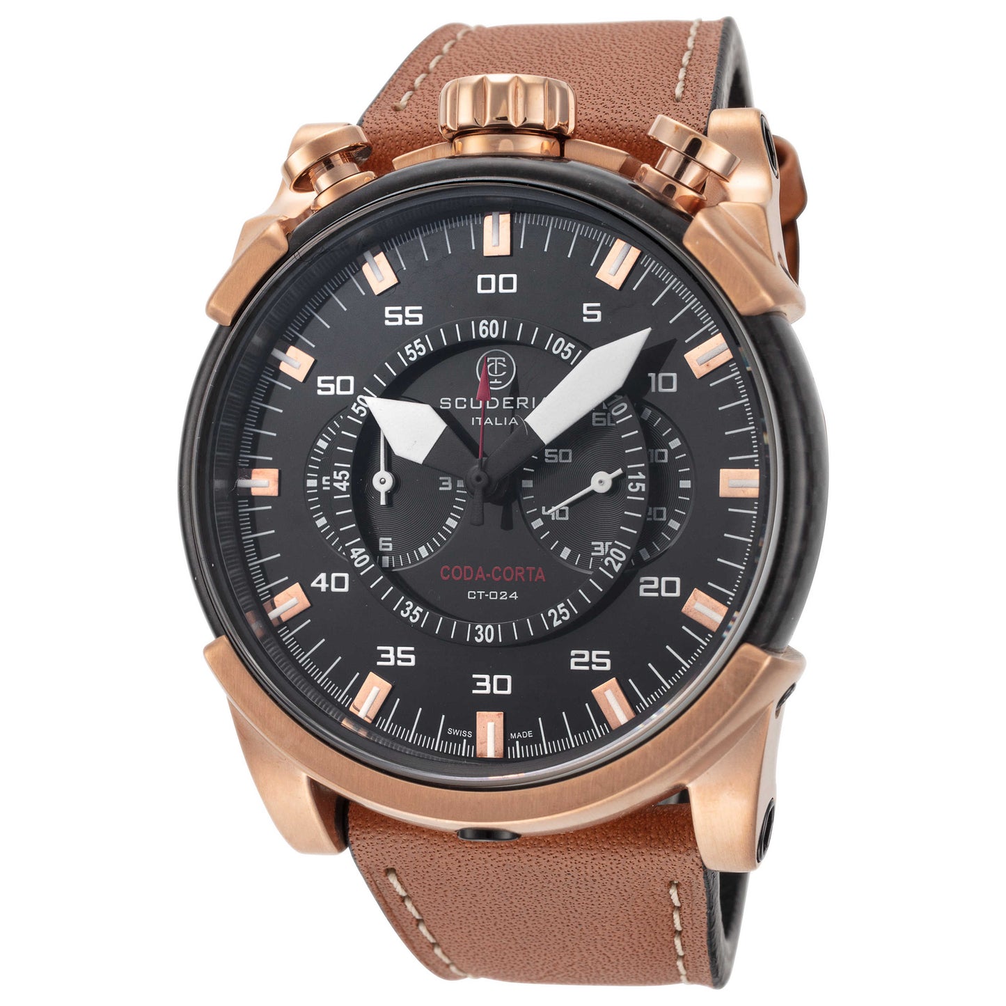 The CT Scuderia Fibra di Carbonio men's quartz watch is a stunning timepiece that is perfect for the modern man. This watch features a Swiss-made Ronda 3520D movement with a screw-down crown, and chronograph functions. The black dial is easy to read, and the brown leather strap is comfortable to wear. The case size is 44 mm, and the case water resistance is 100 m (330 feet).