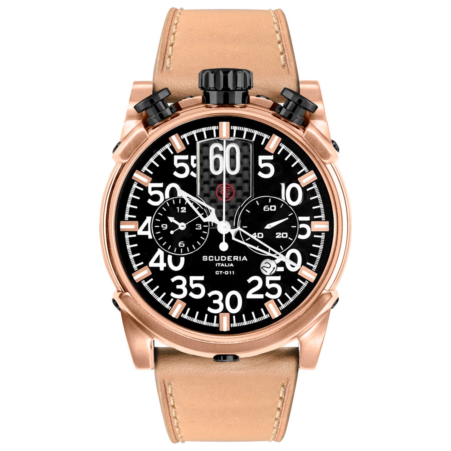 The CT Scuderia Touring men's quartz watch is a high-quality timepiece made in Switzerland. It features a Swiss-made Ronda 3520D movement with a screw-down crown, and it has a black dial. The watch case is made of stainless steel and it is 44 mm in size. The case back is closed and the case crystal is scratch-resistant sapphire crystal. The watch band is a brown leather strap with a pin buckle clasp style. The water resistance of this watch is 100 m (330 feet).