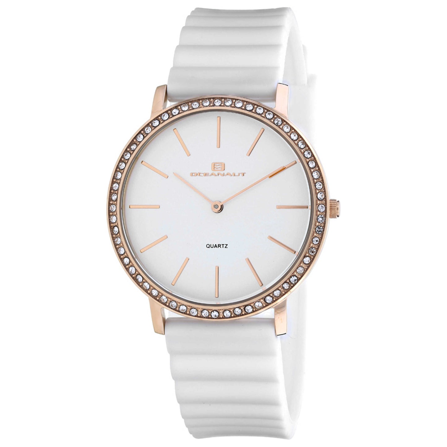 Exude sporty elegance with the Oceanaut Ripple women's watch, a practical accessory that's both chic and durable. Driven by a quartz movement, this watch features a 40mm stainless steel case and a pull and push crown. Its round case houses a crisp white dial, protected by a mineral crystal. The watch boasts a water resistance of up to 30m, perfect for your adventurous lifestyle. It comes with a comfortable white rubber strap, adding a trendy appeal, that securely fastens with a pin buckle. This Oceanaut piece truly ripples with style! OC0266