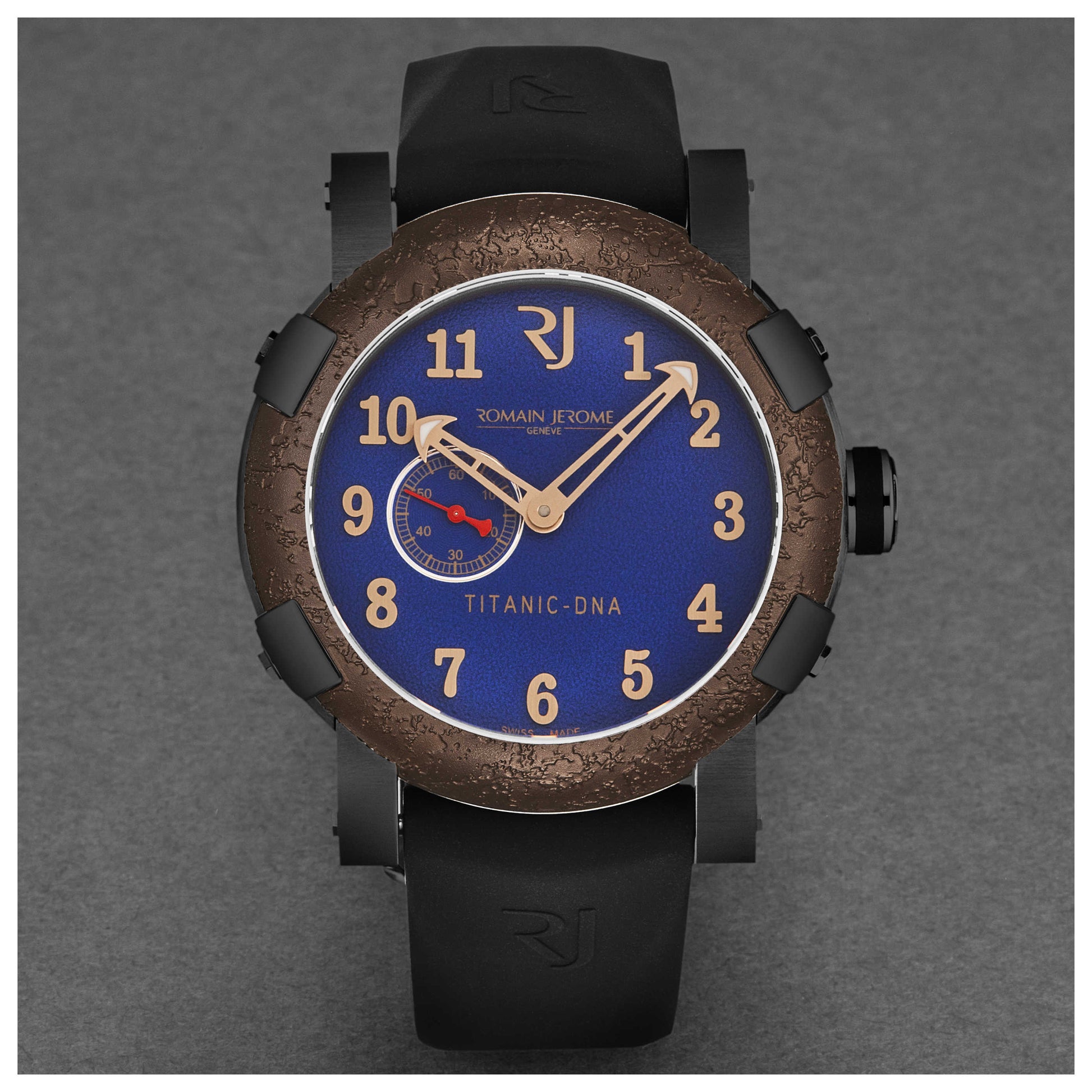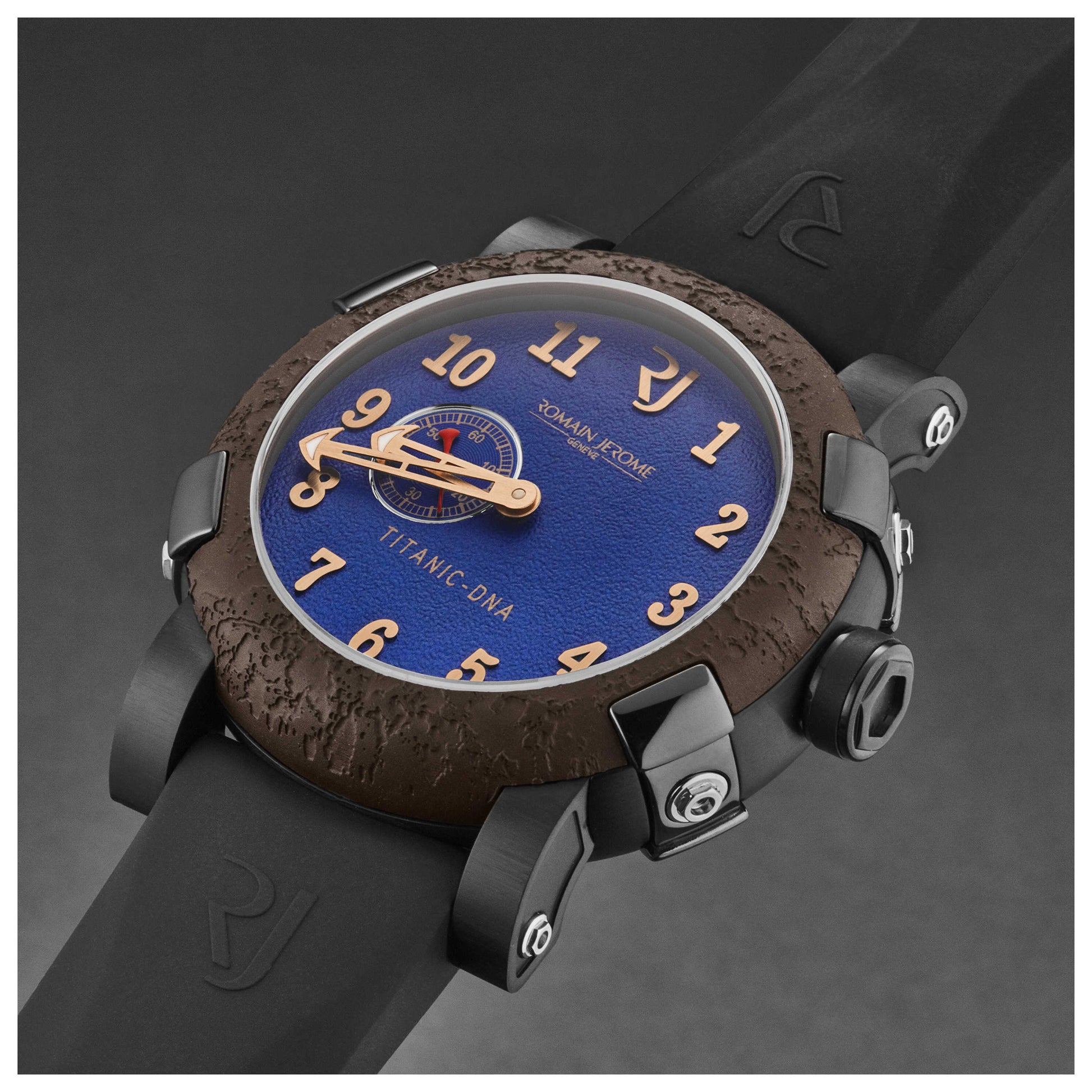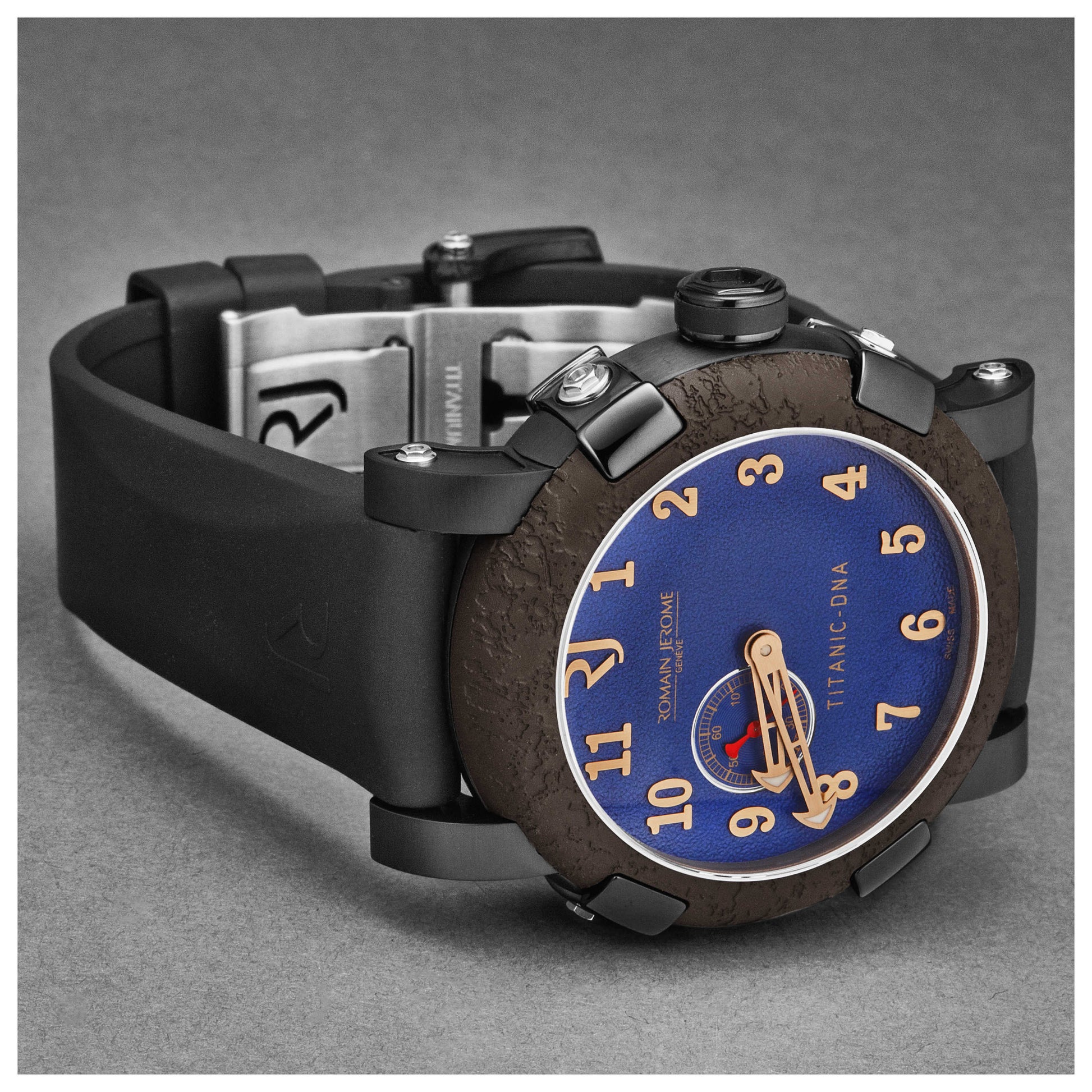 Introducing the Romain Jerome Titanic watch, a Swiss-made marvel for the contemporary man. This automatic watch boasts a power reserve of 38 hours, encased in a 46mm black stainless steel case with a round, blue dial under scratch-resistant sapphire crystal. The watch's closed back enhances its 30m water resistance, making it perfect for daily wear. Complementing the robust case is a black rubber strap, which ensures a comfortable fit with a secure deployment clasp. Get this exceptional timepiece and enjoy Swiss precision with every tick. RJTIAU.503.20