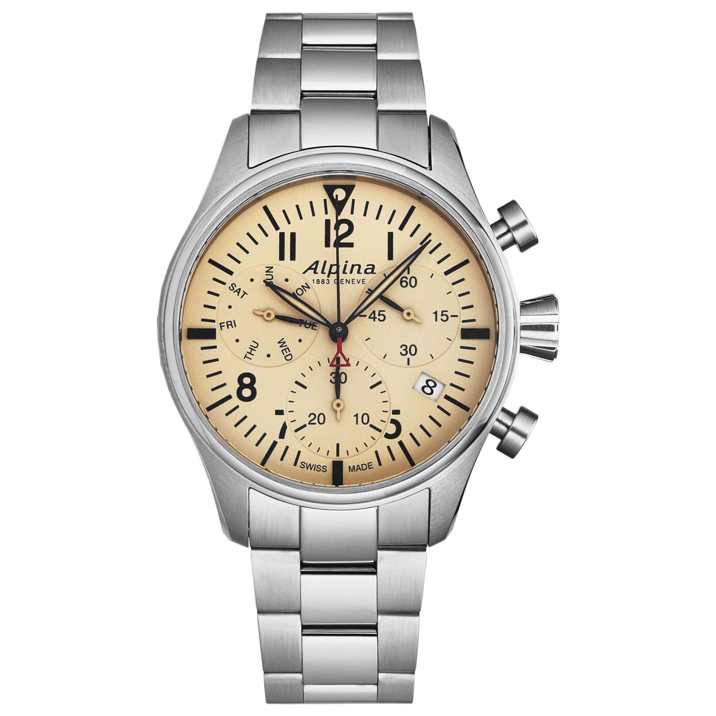 Exude sophistication with the Alpina Startimer Pilot men's watch, a Swiss-made timepiece that reflects the precision of its origins. This round quartz watch features a 42mm stainless steel case, enclosed by scratch-resistant sapphire crystal. Its screw-down crown and 100m water resistance ensure durability, while the closed case back offers a sleek finish. The beige dial presents a date feature for practicality. This timepiece is completed with a silver stainless steel bracelet that fastens securely with a deployment clasp, blending style and functionality seamlessly. AL371BG4S6B