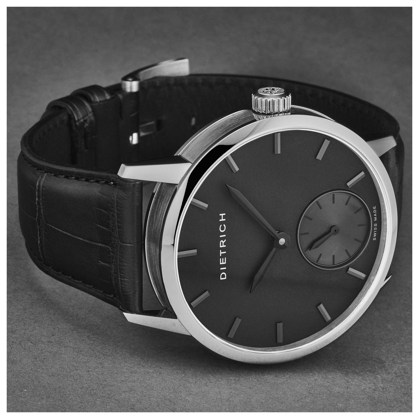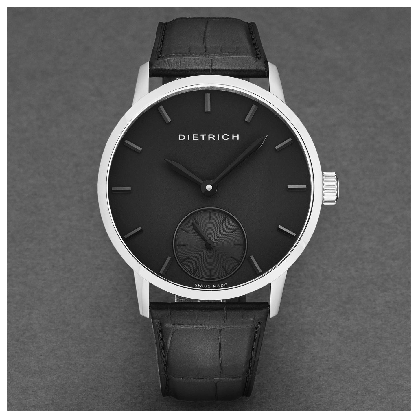 Introducing the Dietrich Night watch, a standout choice for men who appreciate Swiss craftsmanship. Made in Switzerland, this manual-wind timepiece has a robust stainless steel round case of 43mm, housing a captivating black dial. The scratch-resistant sapphire crystal and exhibition case back showcase its intricate movement. Designed for durability, it includes a pull and push crown and has a water resistance of 30m. Encasing your wrist with a luxurious black alligator leather strap that fastens securely with a pin buckle, this watch perfectly blends practicality with sophistication. NB ALL BLKSS