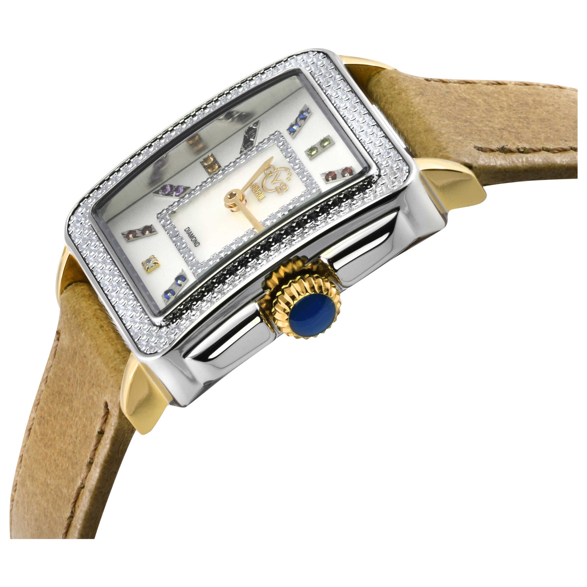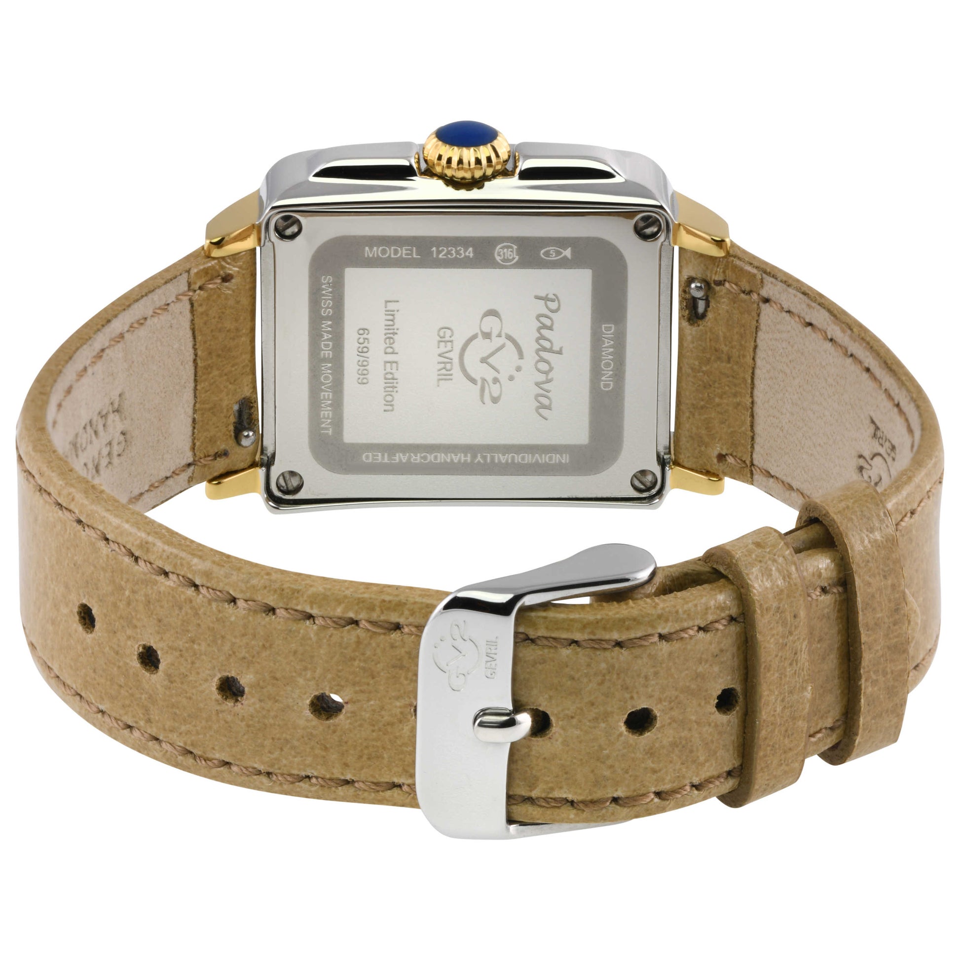 Experience the intersection of style and elegance with the GV2 by Gevril Padova Gemstone women's watch, a true Swiss-made masterpiece. This rectangular timepiece, constructed from stainless steel, features a quartz movement enclosed within a 30mm case. Its dial, boasting a luminous white mother-of-pearl color, is protected by a scratch-resistant, anti-reflective sapphire crystal. The closed back and pull and push crown enhance the case's water resistance, standing firm at 50m. Complementing its case, the watch is elegantly paired with a tan leather strap, ensuring secure wear with its pin buckle. 12334.1