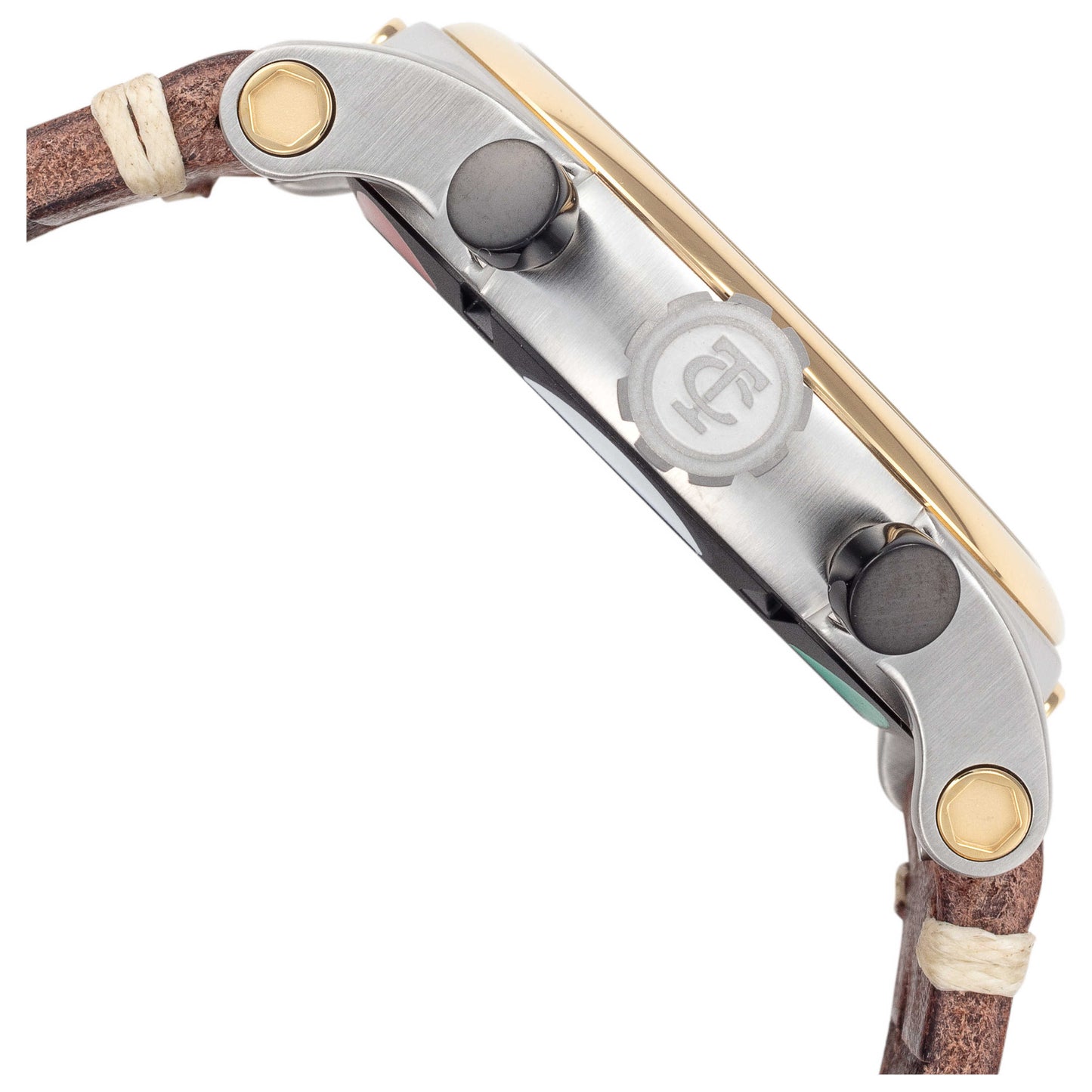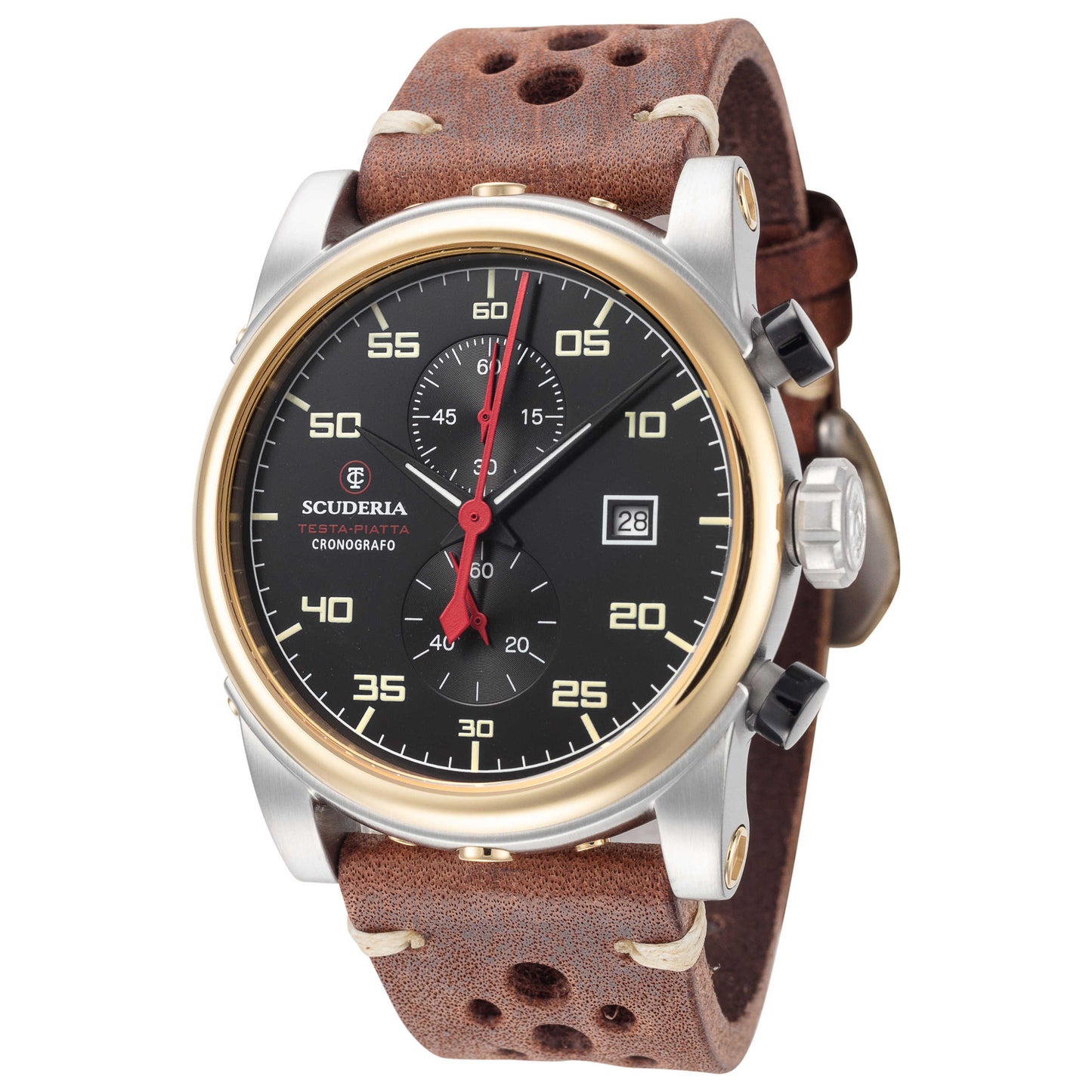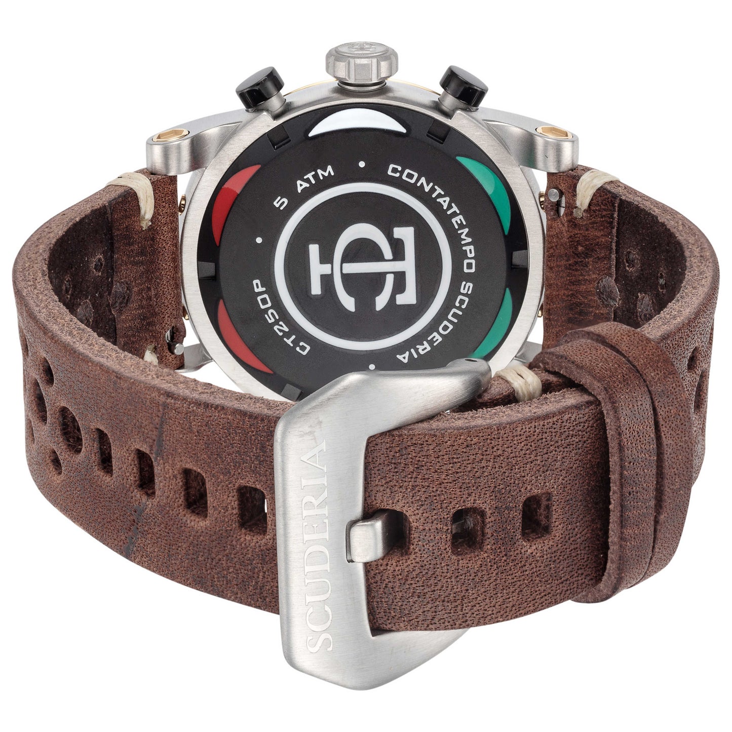 The CT Scuderia Testa Piatta men's quartz watch is the perfect combination of classic style and modern features. Featuring a black dial, stainless steel case with mineral crystal and closed back, this watch is built to last. Powered by the Japanese-made Miyota 0S11 movement with screw-down crown, it offers chronograph functionality along with 50 m (165 feet) water resistance for peace of mind while swimming or snorkeling. The 42 mm round case also comes paired with a brown leather strap secured by pin buckle clasp.