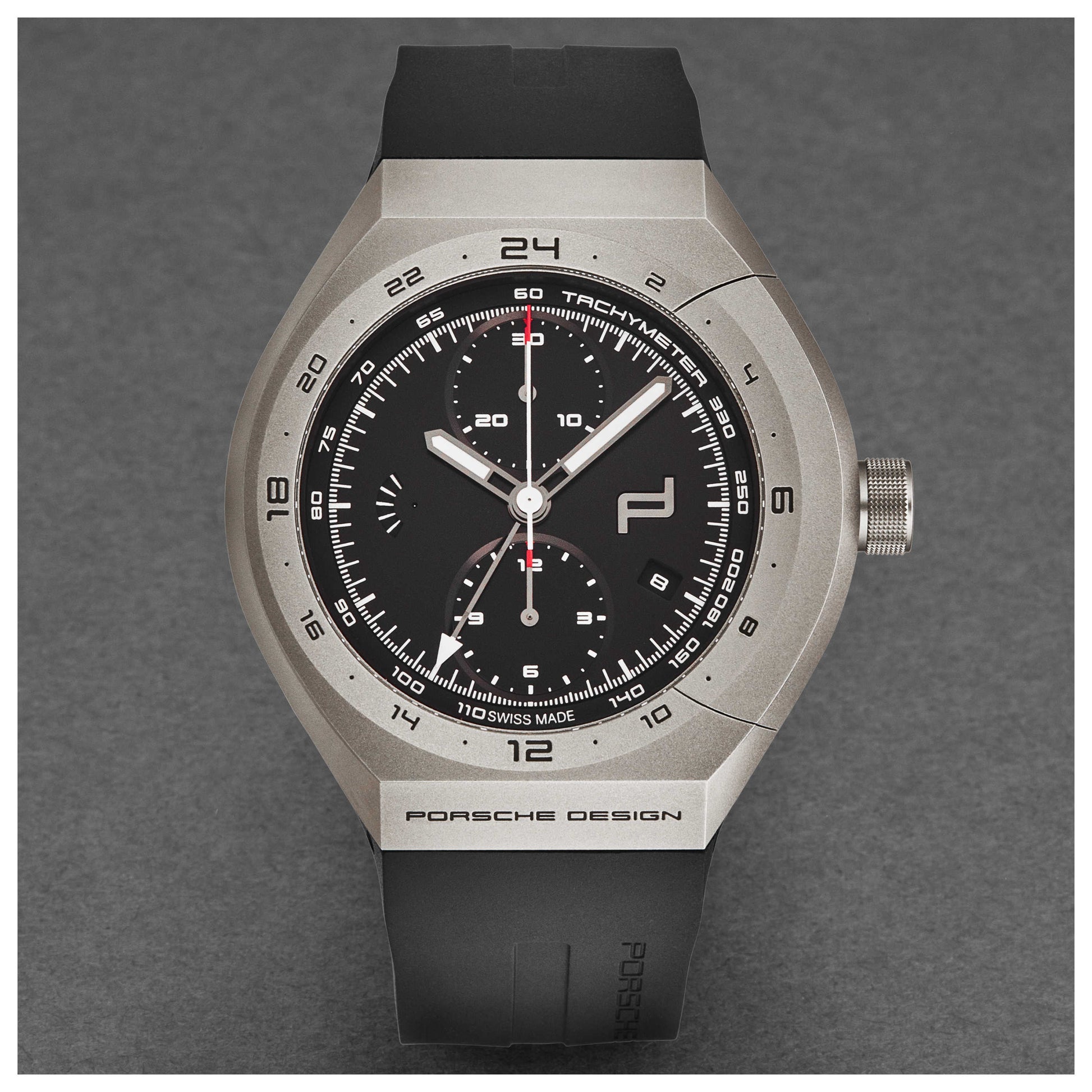 Introducing the Porsche Monobloc Actuator, a sleek, Swiss-made men's watch that blends superior functionality with undeniable style. This automatic timepiece features a 45.5mm round titanium case with an exhibition back, encased by a scratch-resistant sapphire crystal. The black dial, highlighted by the useful features of a chronograph, date and GMT, sits perfectly with a grey rubber strap that ensures comfort and durability with a deployment clasp. With a water resistance of up to 100m, and a screw-down crown, this watch offers both robustness and sophistication, making it an excellent addition to any man's collection. 6030.602001.052