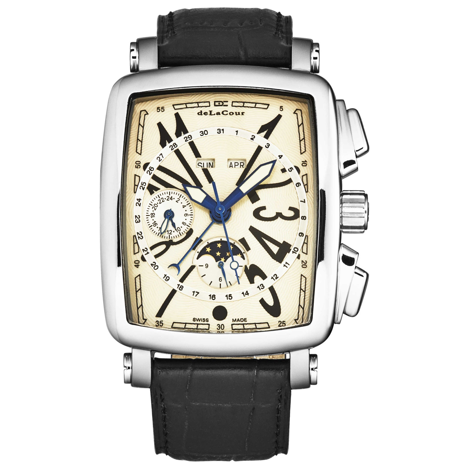 Step into the world of DeLaCour with the ViaLarga Men's Watch, a masterpiece made in Switzerland that exemplifies precision and style. This automatic chronograph features a robust rectangular stainless steel case, capped with scratch-resistant sapphire crystal and an exhibition case back. At 38mm wide, it offers water resistance up to 30m (100 feet). Its beige dial pairs seamlessly with a black leather strap, finished with a pin buckle for secure wearing. A date display adds functionality to this remarkable timepiece, making it a perfect blend of performance and visual appeal for the discerning gentleman. WAST1026-BEG