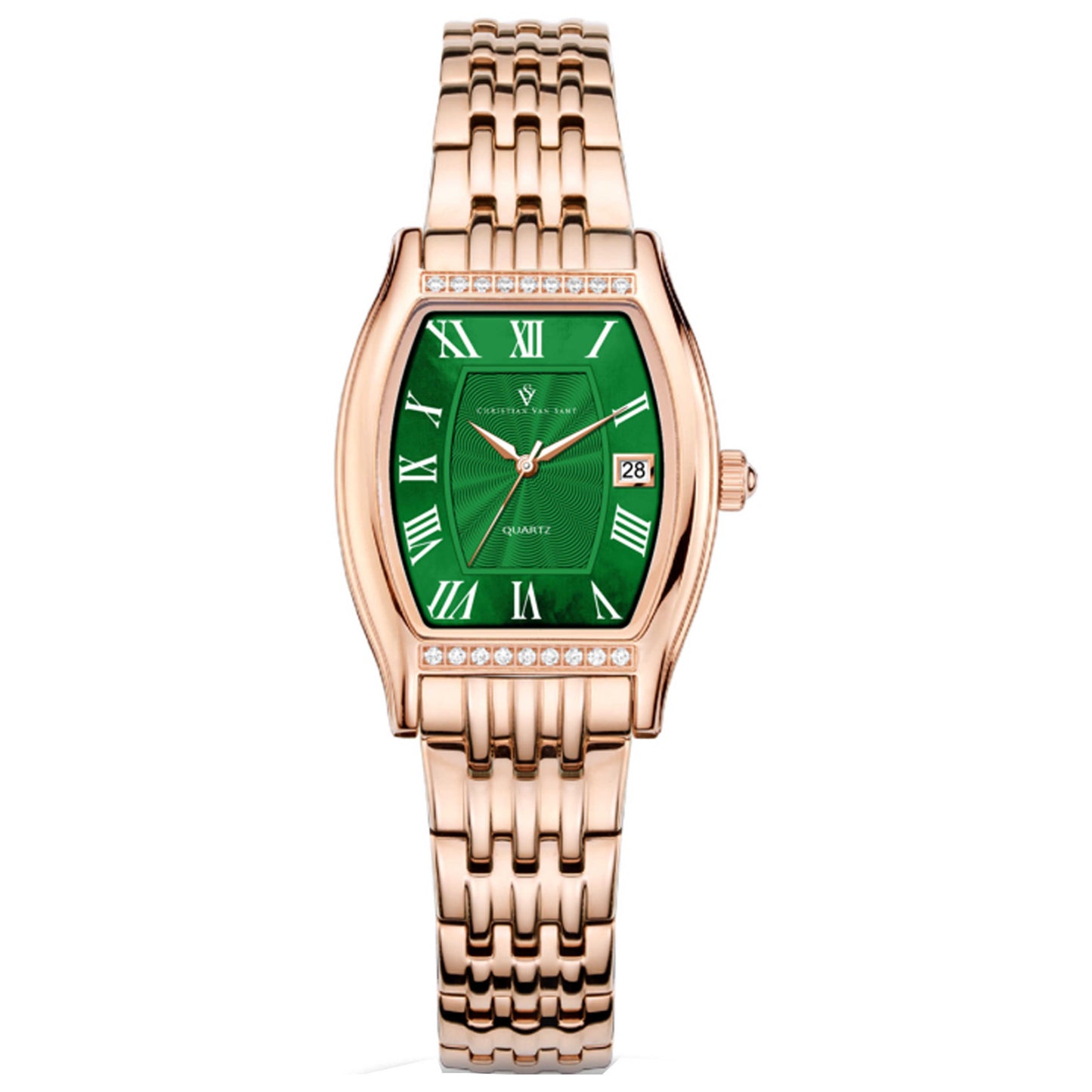 Elevate your elegance with the Christian Van Sant Gemma women's watch. This alluring quartz timepiece is housed in a 34mm stainless steel square case, protected by mineral crystal. The deep green dial offers a charming contrast to the rose gold stainless steel bracelet, while the pull and push crown allows for effortless time adjustment. This watch showcases a useful date feature and boasts a water resistance of up to 30m. Secure it comfortably around your wrist with the deployment clasp and make an elegant style statement. CV2454