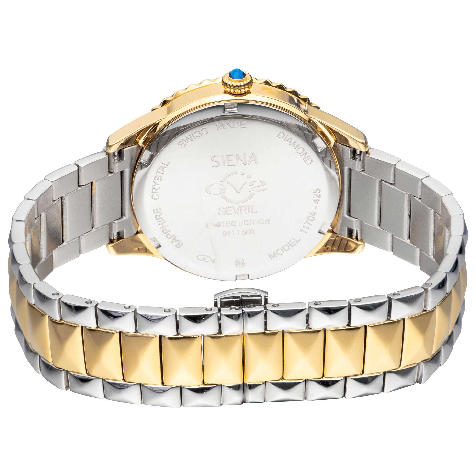Showcase timeless elegance with the GV2 by Gevril Siena women's watch, a beautifully designed piece made in Switzerland. This Swiss-made quartz timepiece features a round 38mm stainless steel case that houses a silver dial, protected by an anti-reflective, scratch-resistant sapphire crystal. Its pull and push crown allows for easy adjustments. With a water resistance of up to 30m, this closed-back watch offers resilience for everyday wear. The bracelet, crafted from stainless steel in a striking silver and gold color combination, secures with a deployment clasp for a comfortable, secure fit. 11704-425