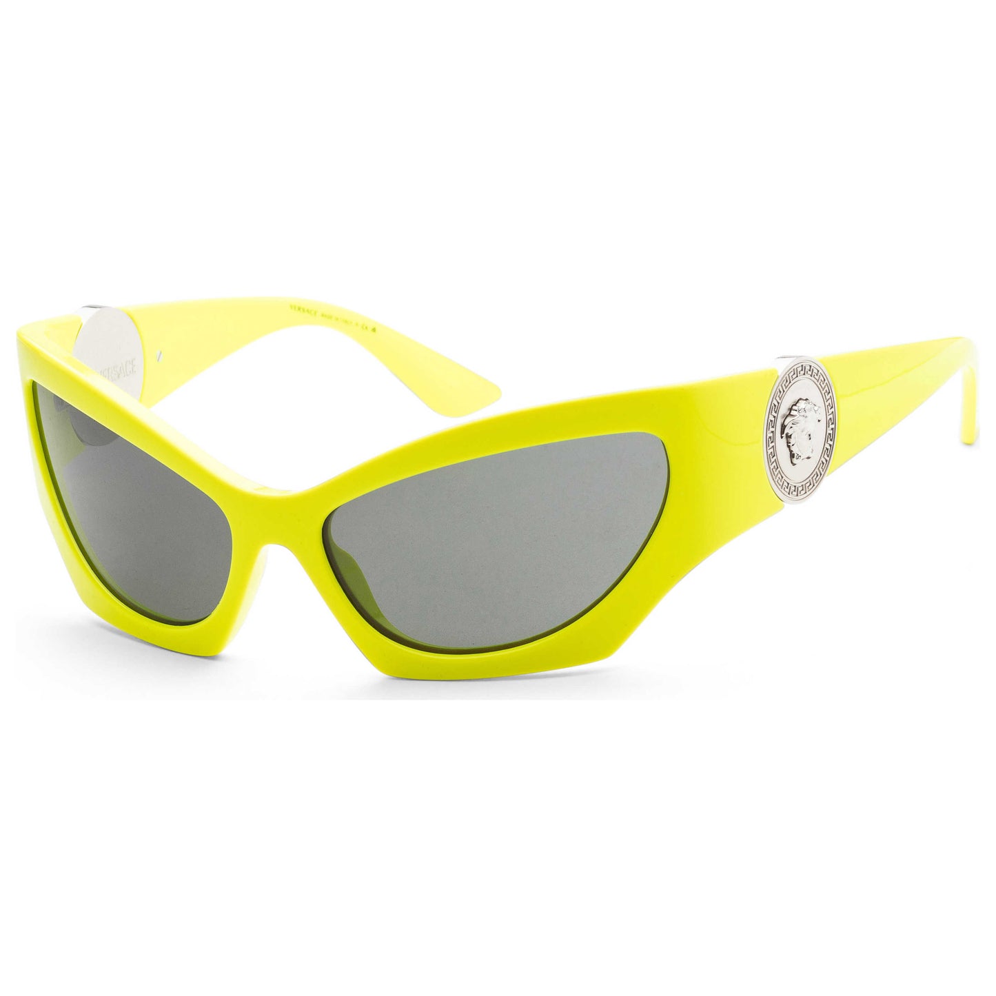 Versace women's sunglasses offer a vibrant expression of style. These Italian-made cat-eye frames are crafted from yellow plastic, housing 60mm grey lenses that provide 100% UV protection. VE4450-541887-60
