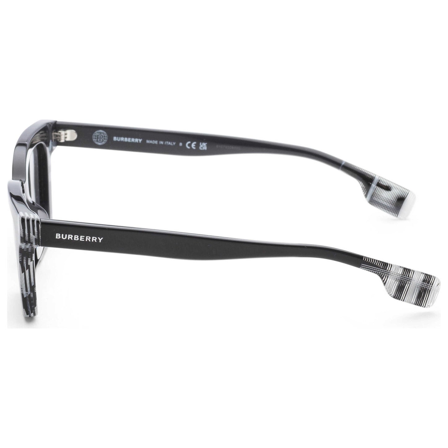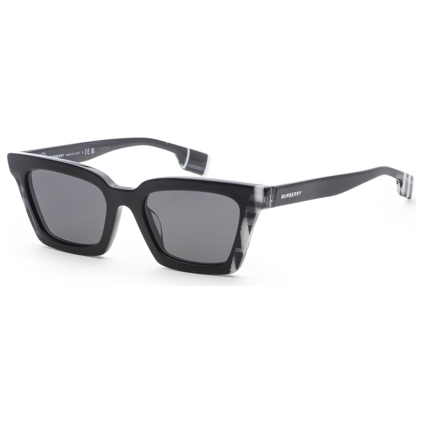 Introducing Burberry's Briar sunglasses for women. Boasting a black acetate square frame highlighted by white black Burberry Check, these sunnies provide 100% UV protection with their 52mm dark grey lenses. Italian-made elegance at its best. BE4392U-405187-52