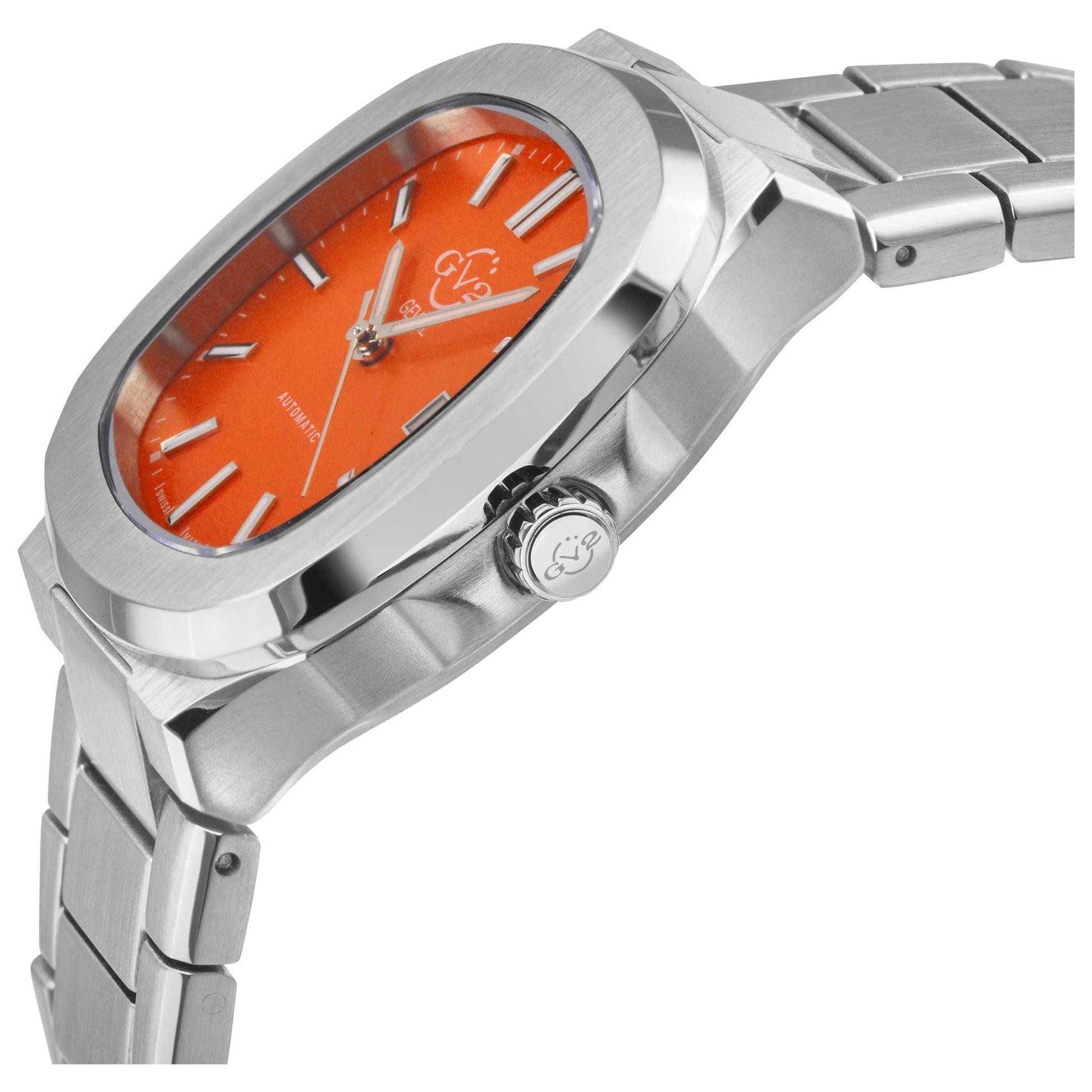 Elevate your style with the GV2 by Gevril Potente men's watch, an exquisite timepiece crafted in Switzerland. Powered by an automatic Swiss-made movement, this stylish accessory features a sturdy stainless steel cushion case of 40mm, fitted with scratch-resistant, anti-reflective sapphire crystal. An exhibition case back and pull and push crown add to its convenience. The watch boasts a vivid orange dial and is water-resistant up to 50m. The silver stainless steel bracelet comes with a deployment clasp, adding a sophisticated finishing touch to this stately piece. 18114B