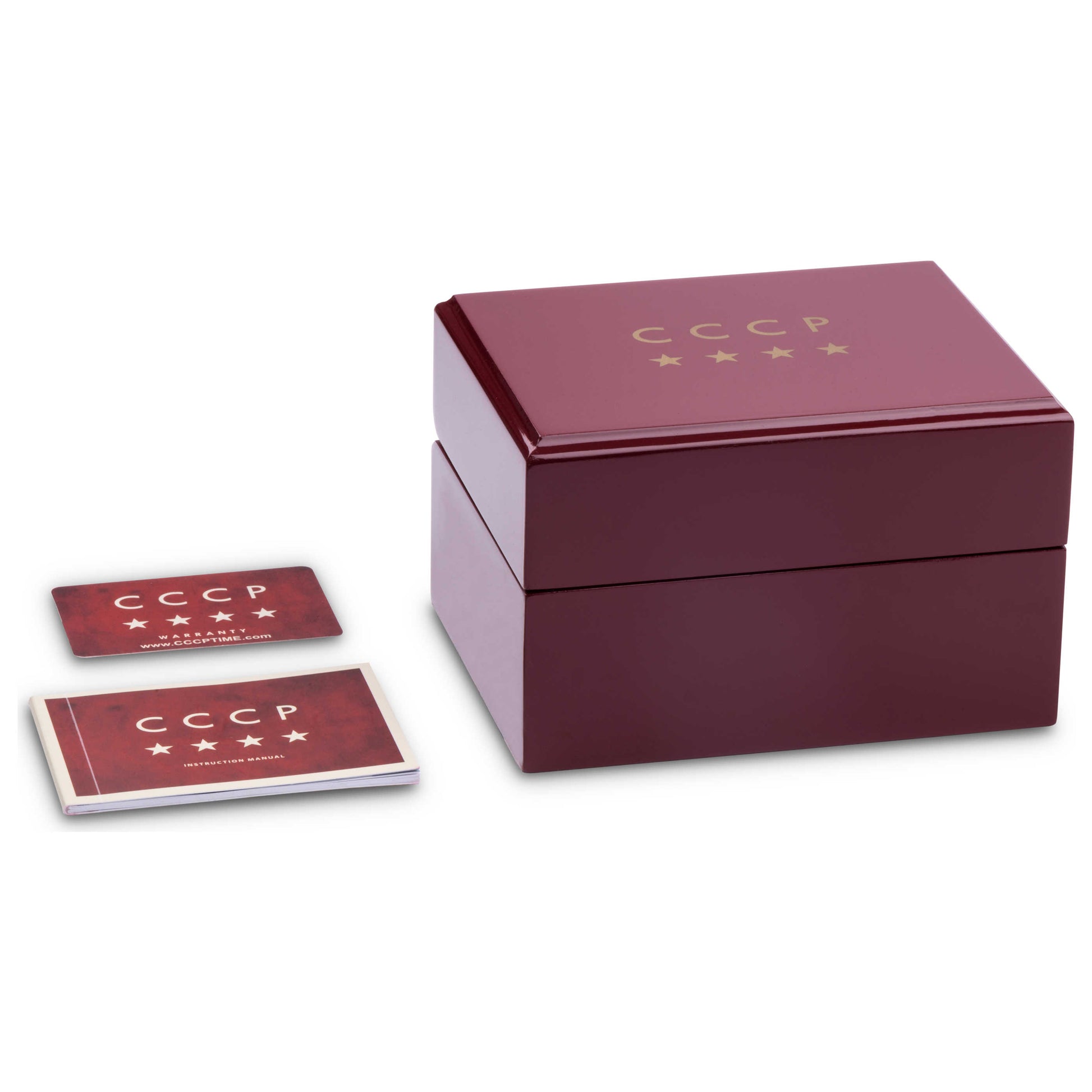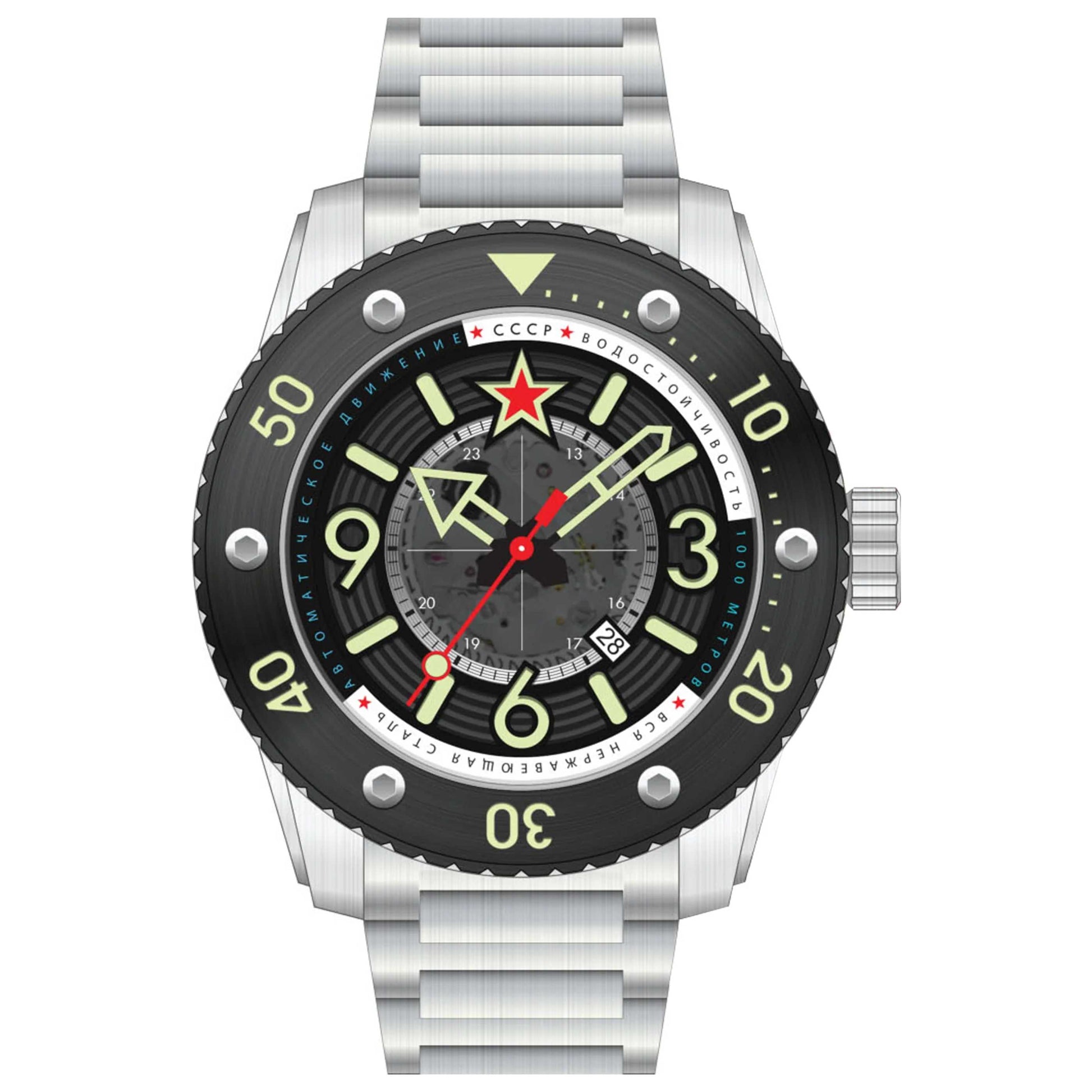 Immerse yourself in the innovative excellence of the CCCP Naval Barrakuda watch. This Men's automatic timepiece is powered by a Japanese Miyota 8215 movement, offering a 40-hour power reserve. The round, stainless steel case, 54mm in width, houses a striking black dial protected by a scratch-resistant sapphire crystal. With a massive water resistance of 1000m, this watch is built for deep adventures. The silver stainless steel bracelet completes the timepiece's robust aesthetics and ensures a secure fit with a deployment clasp. This Naval Barrakuda watch harmoniously blends performance and style. CP-7094-11