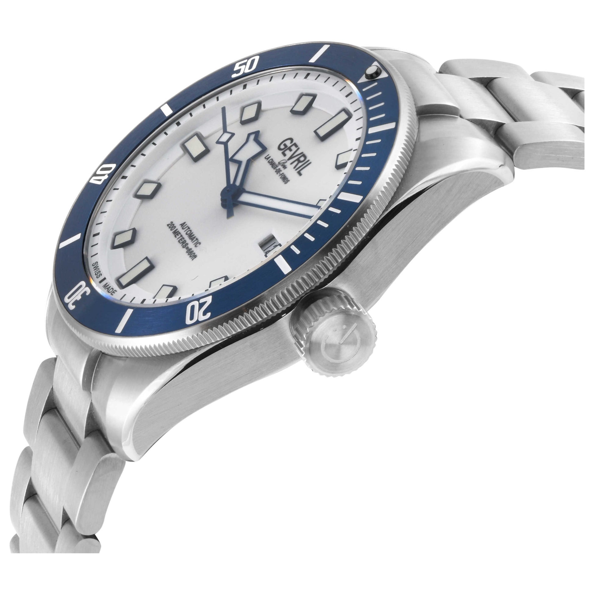 Introducing the Gevril Yorkville men's watch, a masterpiece crafted in Switzerland. This automatic timepiece boasts a Swiss-made movement and a screw-down crown that ensures precise timekeeping. It comes with a 43mm stainless steel case, built for resilience and showcasing an exhibition back. Protected by scratch-resistant sapphire crystal, the watch offers an impressive water resistance of up to 200m. The sleek white dial features a convenient date display, enclosed within a silver stainless steel bracelet with a secure deployment clasp. The Yorkville collection truly offers a blend of functionality and elegance for the discerning man. 48613B