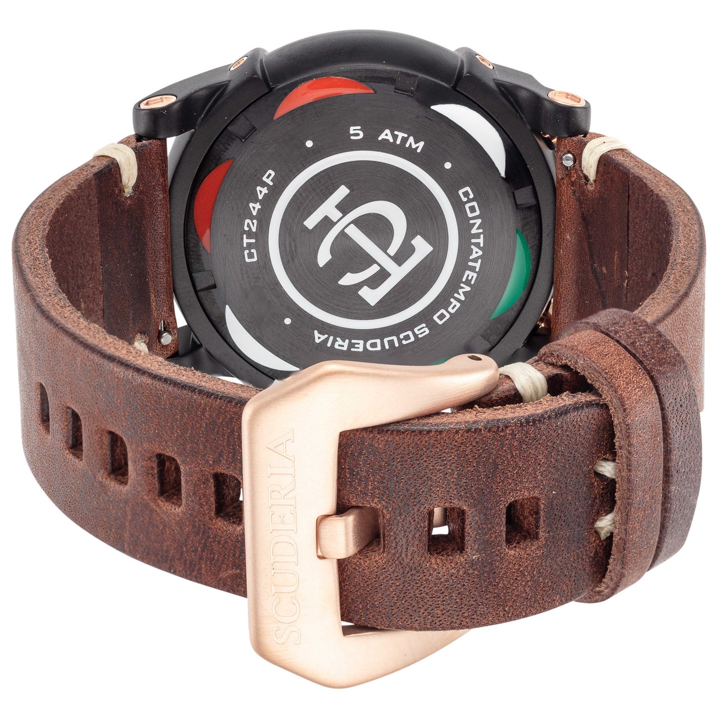 Make a bold statement with the CT Scuderia Racer men's watch. This dynamic timepiece is engineered with a Japanese-made Miyota 0S11 quartz movement, enclosed in a 44mm stainless steel case. The robust, round case, which boasts a 50m water resistance, features a screw-down crown and a closed back for added durability. Under the mineral crystal, the black dial contrasts strikingly with the brown leather strap, secured by a pin buckle. This chronograph from the Racer collection perfectly embodies CT Scuderia's flair for masculine and functional design. CT-244-P