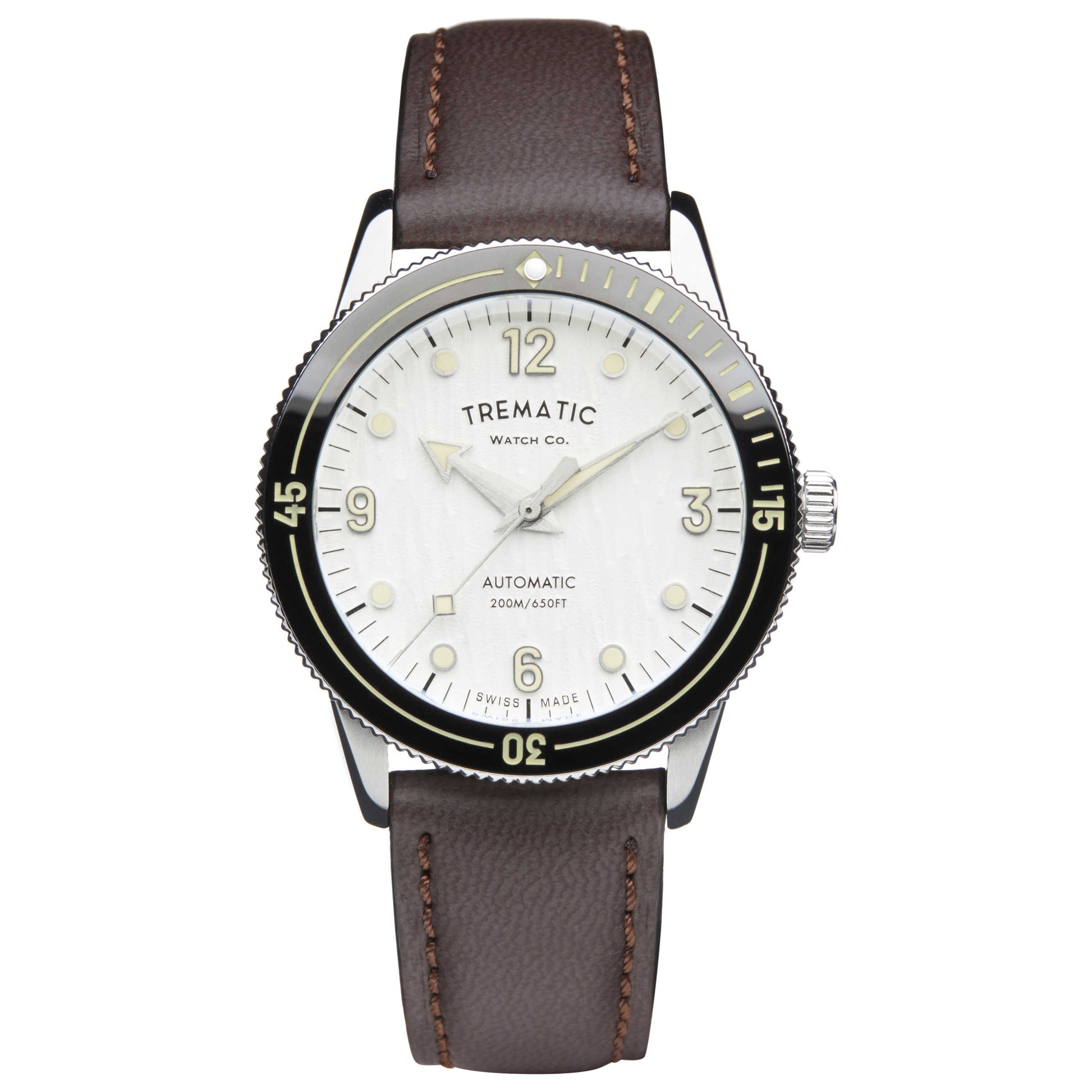 Exude sophistication with the Trematic AC 14 watch, a true testament to Italian craftsmanship. This men's automatic timepiece is encased in a 39mm stainless steel round casing, protected by a scratch-resistant sapphire crystal. The white dial adds a classic touch, well-contrasted by the brown strap made from eco-friendly Vegan Apple Peel. This watch, designed for endurance, features a closed back and promises water resistance up to 200m. It secures comfortably with a pin buckle, proving that style and sustainability can go hand-in-hand. 1412122