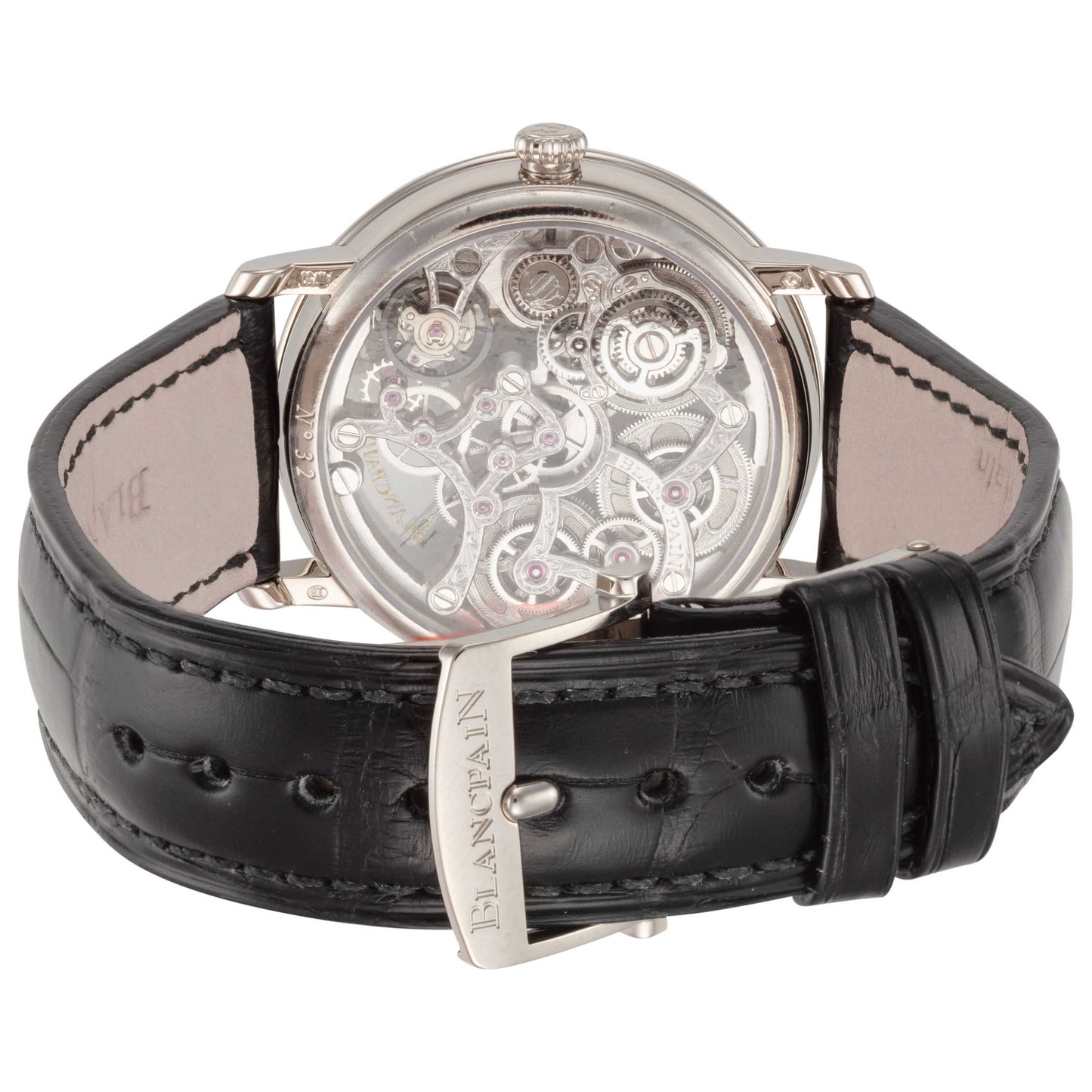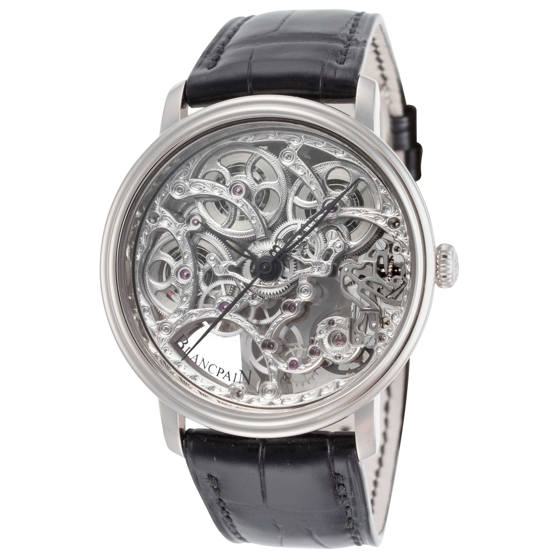 Elevate your style with the men's Blancpain Squelette watch, a sophisticated timepiece exquisitely made in Switzerland. This manual-wind watch is powered by the Swiss-made Specialty 1333SQ movement with an impressive 8-day power reserve. Encased in a 38mm 18K white gold round case with a skeleton dial under a scratch-resistant sapphire crystal, the watch is water-resistant up to 30m. The timepiece showcases an exhibition back, allowing you to admire the intricate workings. The timepiece comes with a green leather alligator strap that complements the white gold casing, securely fastened with a deployment clasp. 6633-1500-55B