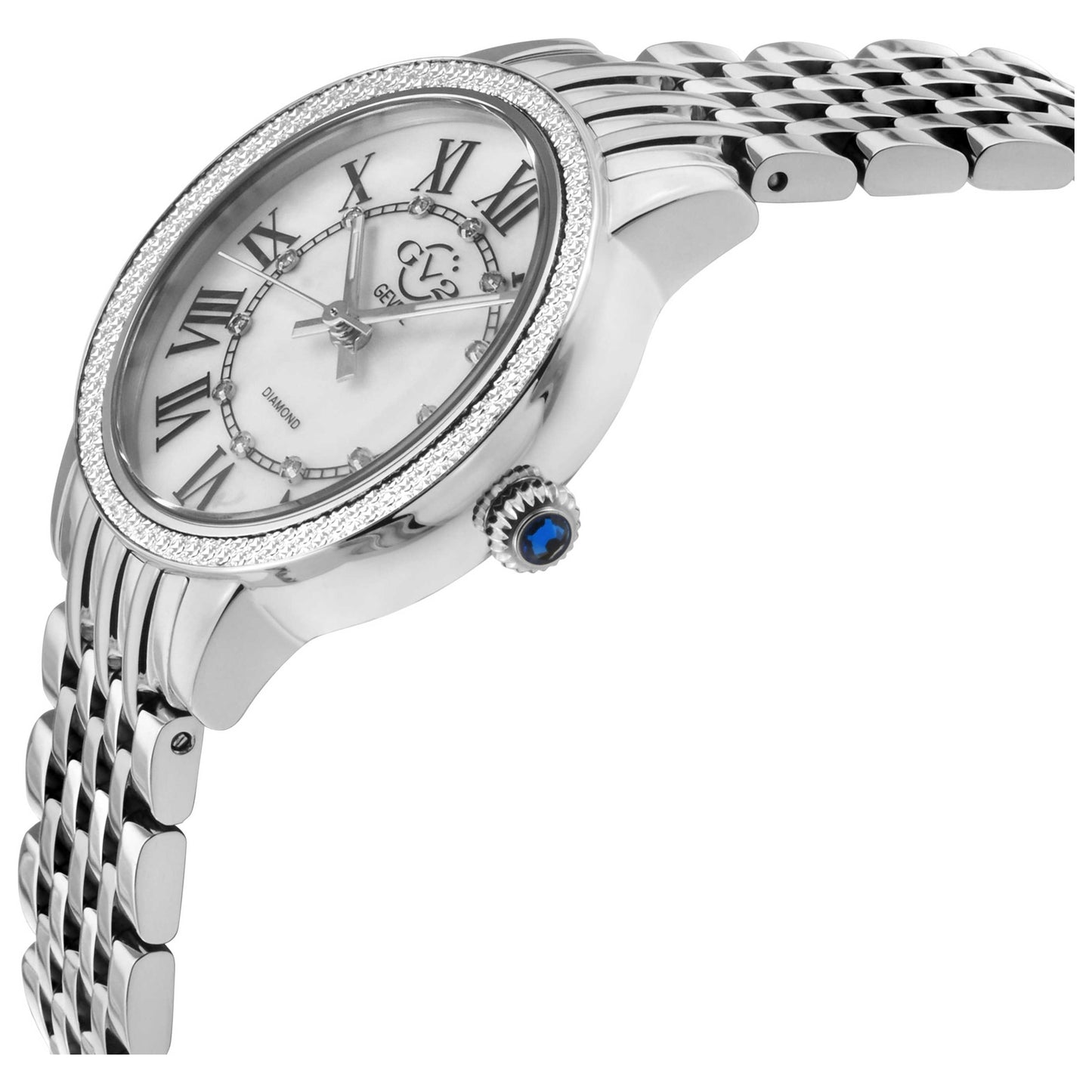 Indulge in luxury with the GV2 by Gevril Astor III watch, a chic piece designed for the contemporary woman. Made in Switzerland, this quartz movement timepiece features a round 34mm stainless steel case and an elegant white mother-of-pearl dial protected by scratch-resistant, anti-reflective sapphire crystal. It's water-resistant up to 50m and the pull and push crown ensures smooth functionality. This Swiss-made beauty is completed with a sleek silver stainless steel bracelet that fastens securely with a deployment clasp. 9150B
